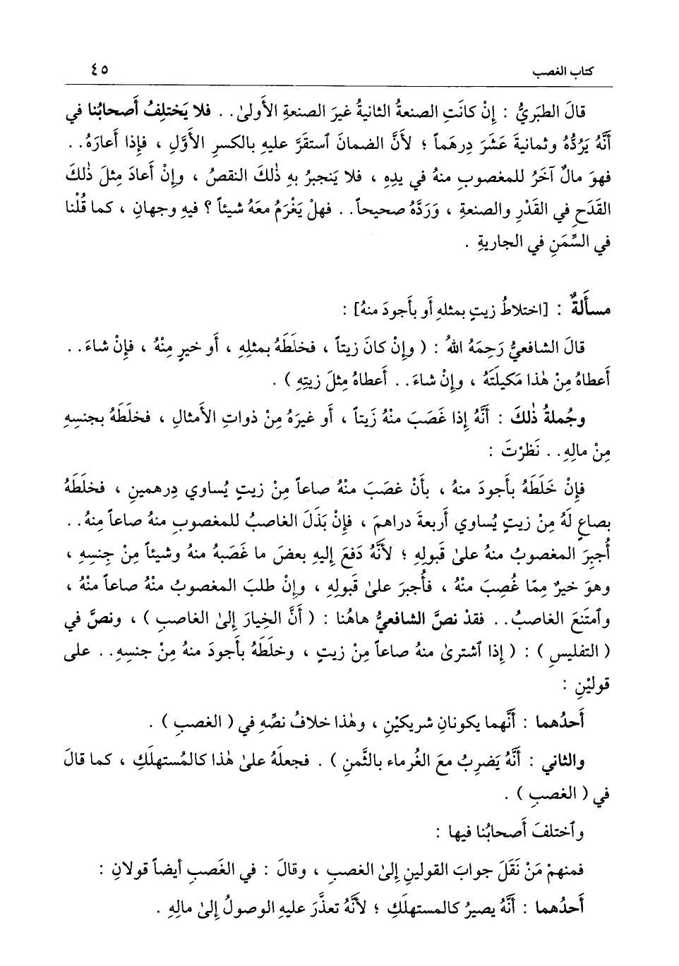 ] : قال الشافعي - رَحِمَهُ اللَّهُ -: (وإن كان زيتاً، فخلطه بمثله، أو خير منه، فإن شاء.. أعطاه من هذا مكيلته، وإن شاء.. أعطاه مثل زيته) .