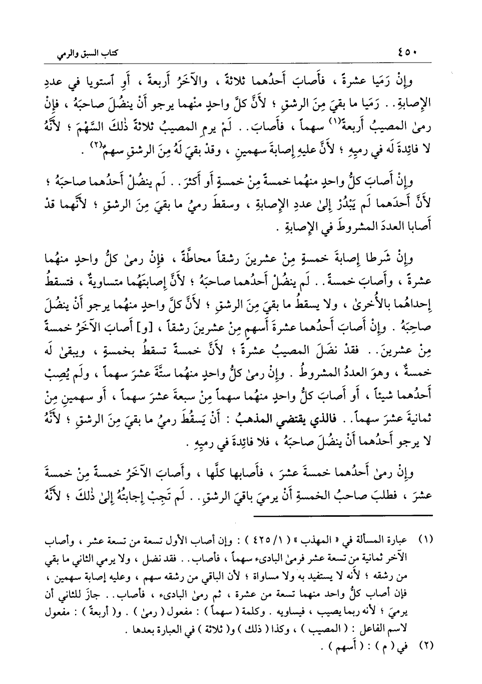 وإن شرطا إصابة خمسة من عشرين رشقًا محاطة، فإن رمى كل واحد منهما عشرة، وأصاب خمسة.. لم ينضل أحدهما صاحبه؛ لأن إصابتهما متساوية، فتسقط إحداهما بالأخرى، ولا يسقط ما بقي من الرشق؛ لأن كل واحد منهما يرجو أن ينضل صاحبه. وإن أصاب أحدهما عشرة أسهم من عشرين رشقًا، [و] أصاب الآخر خمسة من عشرين.. فقد نضل المصيب عشرة؛ لأن خمسة تسقط بخمسة، ويبقى له خمسة، وهو العدد المشروط. وإن رمى كل واحد منهما ستة عشر سهمًا، ولم يصب أحدهما شيئًا، أو أصاب كل واحد منهما سهمًا من سبعة عشر سهمًا، أو سهمين من ثمانية عشر سهمًا.. فالذي يقتضي المذهب: أن يسقط رمي ما بقي من الرشق؛ لأنه لا يرجو أحدهما أن ينضل صاحبه، فلا فائدة في رميه.