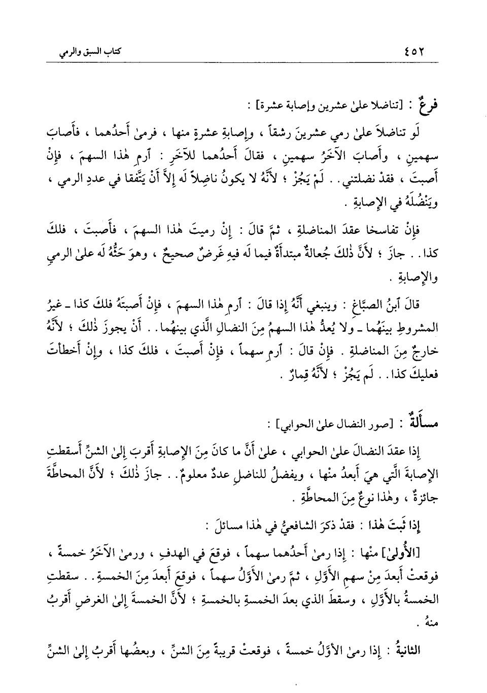 قال ابن الصباغ: وينبغي أنه إذا قال: ارم هذا السهم، فإن أصبته فلك كذا ـ غير المشروط بينهما ـ ولا يعد هذا السهم من النضال الذي بينهما.. أن يجوز ذلك؛ لأنه خارج من المناضلة. فإن قال: ارم سهمًا، فإن أصبت، فلك كذا، وإن أخطأت فعليك كذا.. لم يجز؛ لأنه قمار.