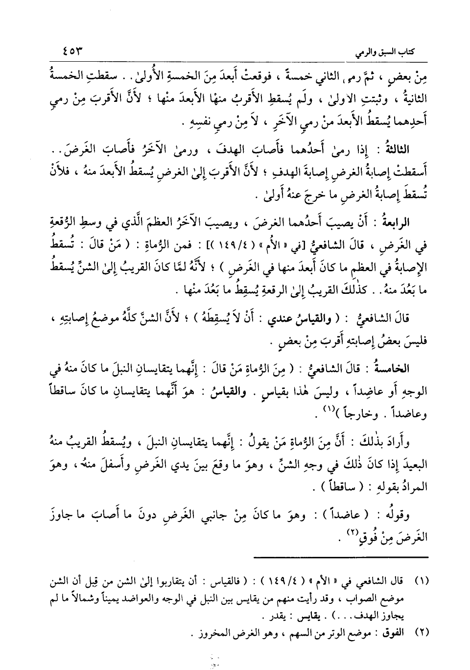 الخامسة: قال الشافعي: (من الرماة من قال: إنهما يتقايسان النبل ما كان منه في الوجه أو عاضدًا، وليس هذا بقياس. والقياس: هو أنهما يتقايسان ما كان ساقطًا وعاضدًا. وخارجًا) .