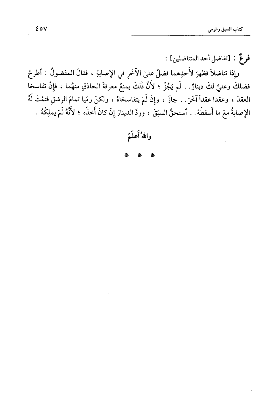 وإذا تناضلا فظهر لأحدهما فضل على الآخر في الإصابة، فقال المفضول: اطرح فضلك وعلي لك دينار.. لم يجز؛ لأن ذلك يمنع معرفة الحاذق منهما، فإن تفاسخا العقد، وعقدا عقدًا آخر.. جاز، وإن لم يتفاسخاه، ولكن رميا تمام الرشق فتمت له الإصابة مع ما أسقطه.. استحق السبق، ورد الدينار إن كان أخذه؛ لأنه لم يملكه.