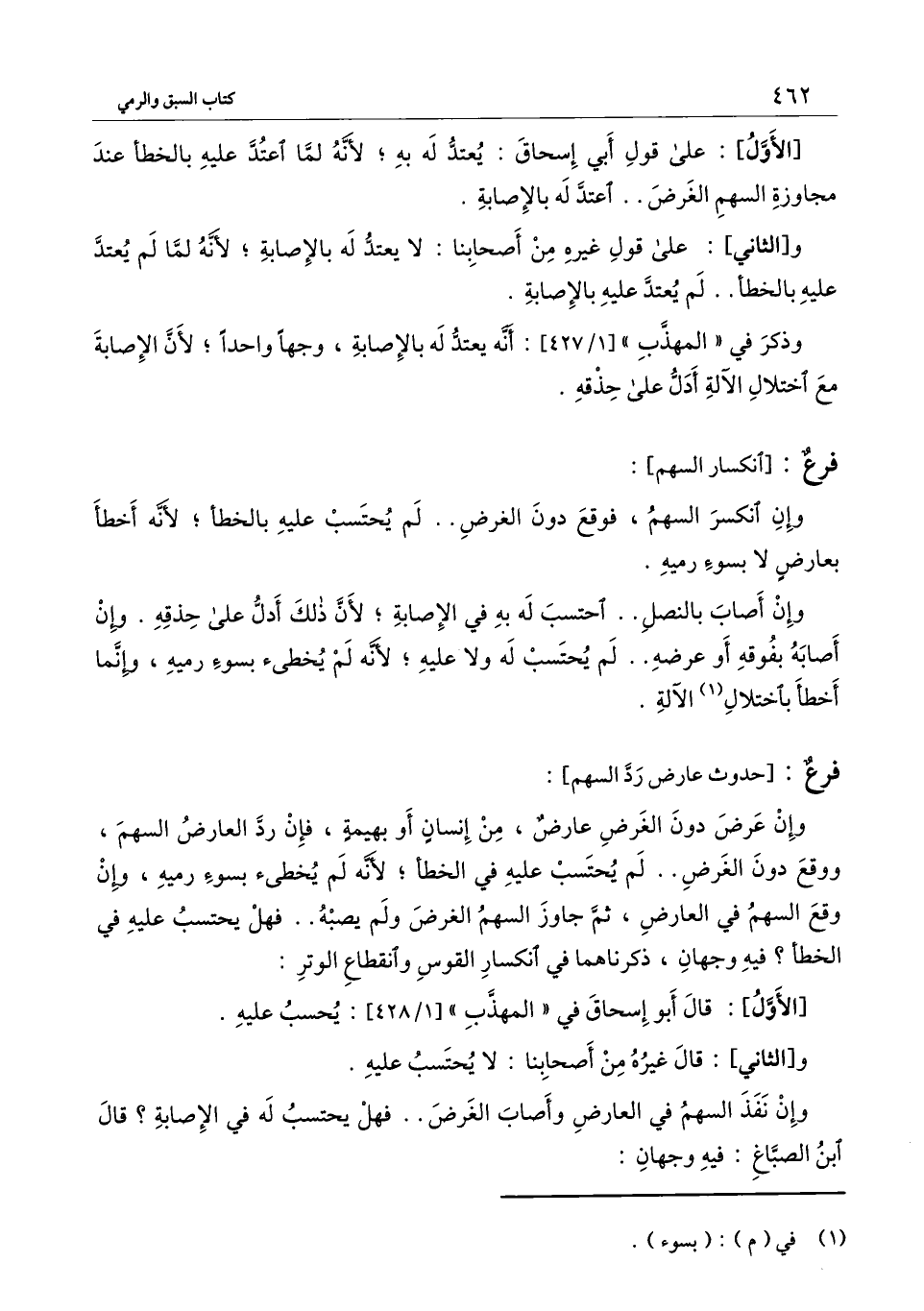 وإن أصاب بالنصل.. احتسب له به في الإصابة؛ لأن ذلك أدل على حذقه. وإن أصابه بفوقه أو عرضه.. لم يحتسب له ولا عليه؛ لأنه لم يخطئ بسوء رميه، وإنما أخطأ باختلال الآلة.
