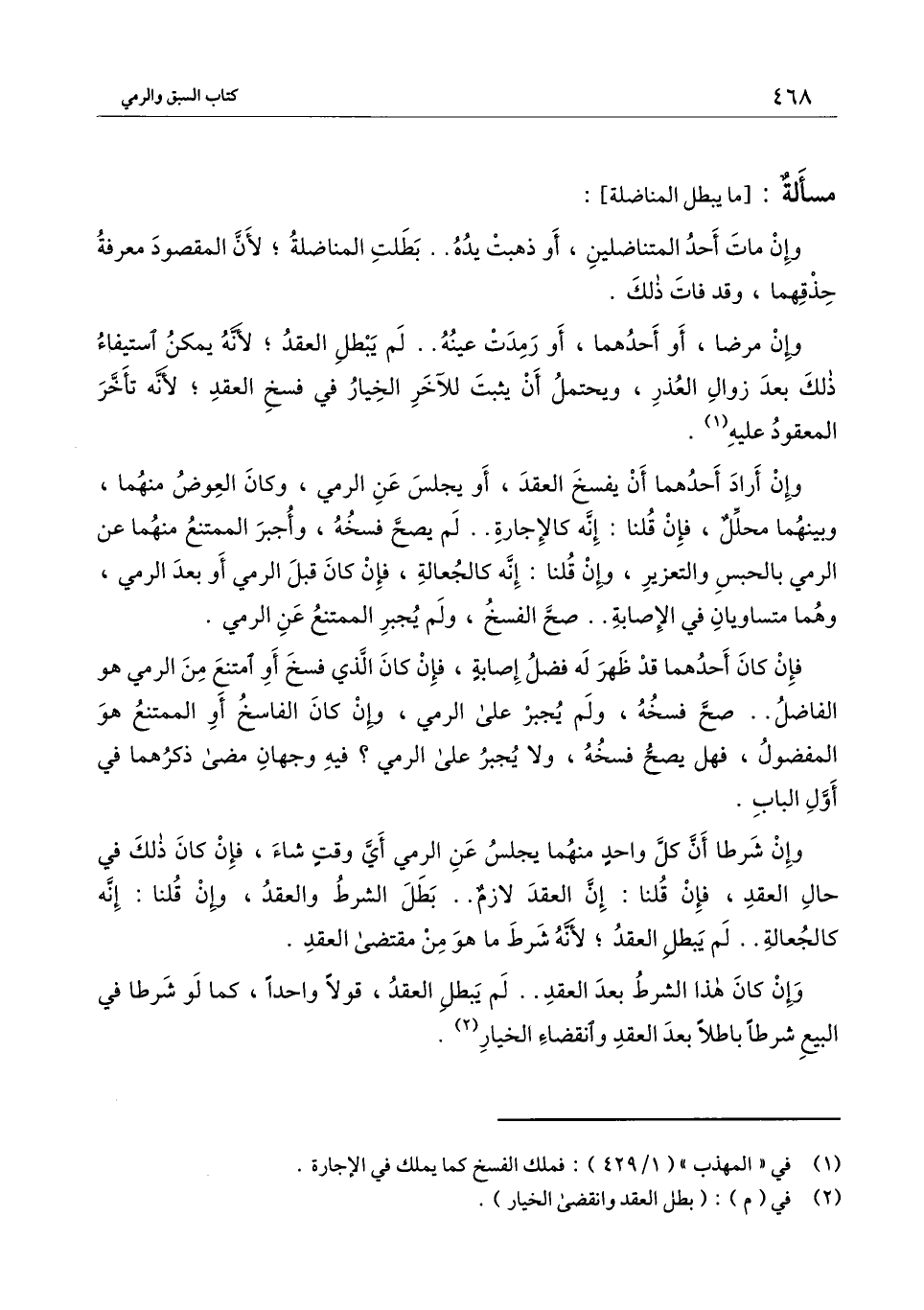 وإن أراد أحدهما أن يفسخ العقد، أو يجلس عن الرمي، وكان العوض منهما، وبينهما محلل، فإن قلنا: إنه كالإجارة.. لم يصح فسخه، وأجبر الممتنع منهما عن الرمي بالحبس والتعزير، وإن قلنا: إنه كالجعالة، فإن كان قبل الرمي أو بعد الرمي، وهما متساويان في الإصابة.. صح الفسخ، ولم يجبر الممتنع عن الرمي.