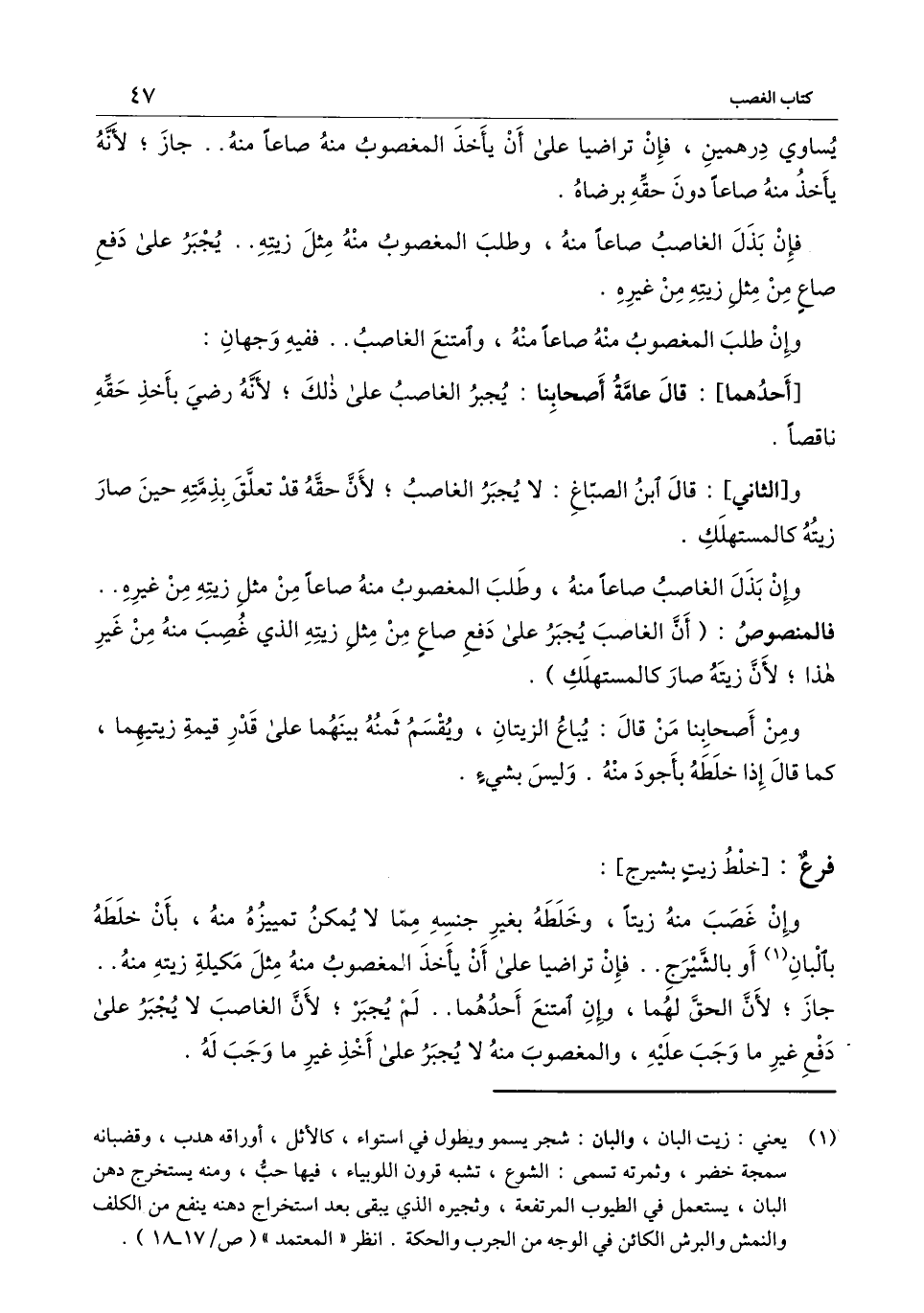 فالمنصوص: (أن الغاصب يجبر على دفع صاع من مثل زيته الذي غصب منه من غير هذا؛ لأن زيته صار كالمستهلك) .