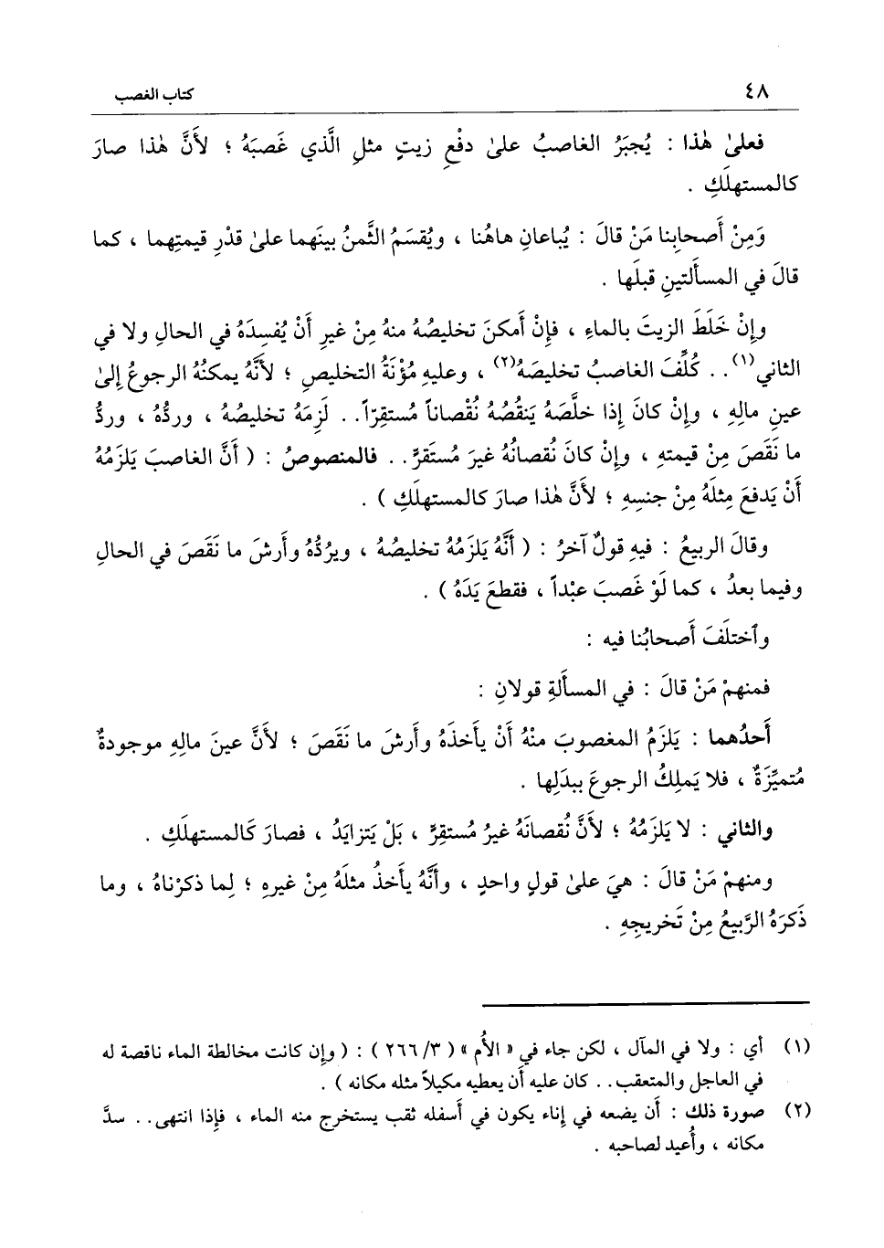 وإن خلط الزيت بالماء، فإن أمكن تخليصه منه من غير أن يفسده في الحال ولا في الثاني.. كلف الغاصب تخليصه، وعليه مؤنة التخليص؛ لأنه يمكنه الرجوع إلى عين ماله، وإن كان إذا خلصه ينقصه نقصاناً مستقراً.. لزمه تخليصه، ورده، ورد ما نقص من قيمته، وإن كان نقصانه غير مستقر.. فالمنصوص: (أن الغاصب يلزمه أن يدفع مثله من جنسه؛ لأن هذا صار كالمستهلك) .