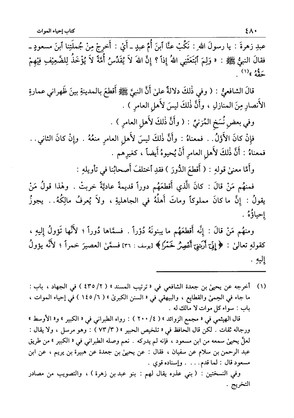 قال الشافعي: (وفي ذلك دلالة على أن النبي - صَلَّى اللَّهُ عَلَيْهِ وَسَلَّمَ - أقطع بالمدينة بين ظهراني عمارة الأنصار من المنازل، وأن ذلك ليس لأهل العامر) .