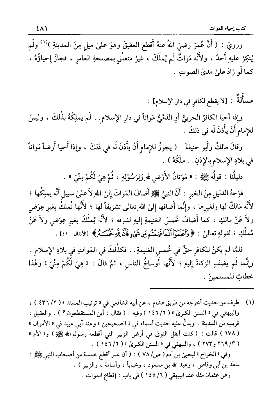 فلما لم يكن للكافر حق في خمس الغنيمة.. فكذلك في الموات في بلاد الإسلام. وإنما لم يضف الزكاة إليه؛ لأنها أوساخ الناس، ثم قال: «هي لكم مني» وهذا خطاب للمسلمين.