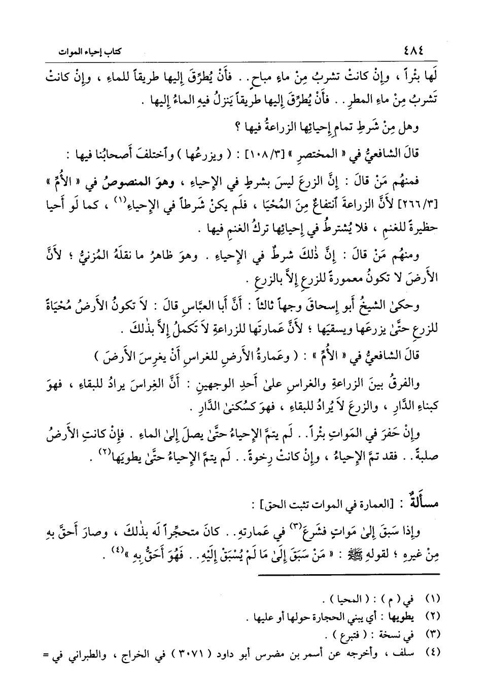 وحكى الشيخ أبو إسحاق وجهًا ثالثًا: أن أبا العباس قال: لا تكون الأرض محياة للزرع حتى يزرعها ويسقيها؛ لأن عمارتها للزراعة لا تكمل إلا بذلك.