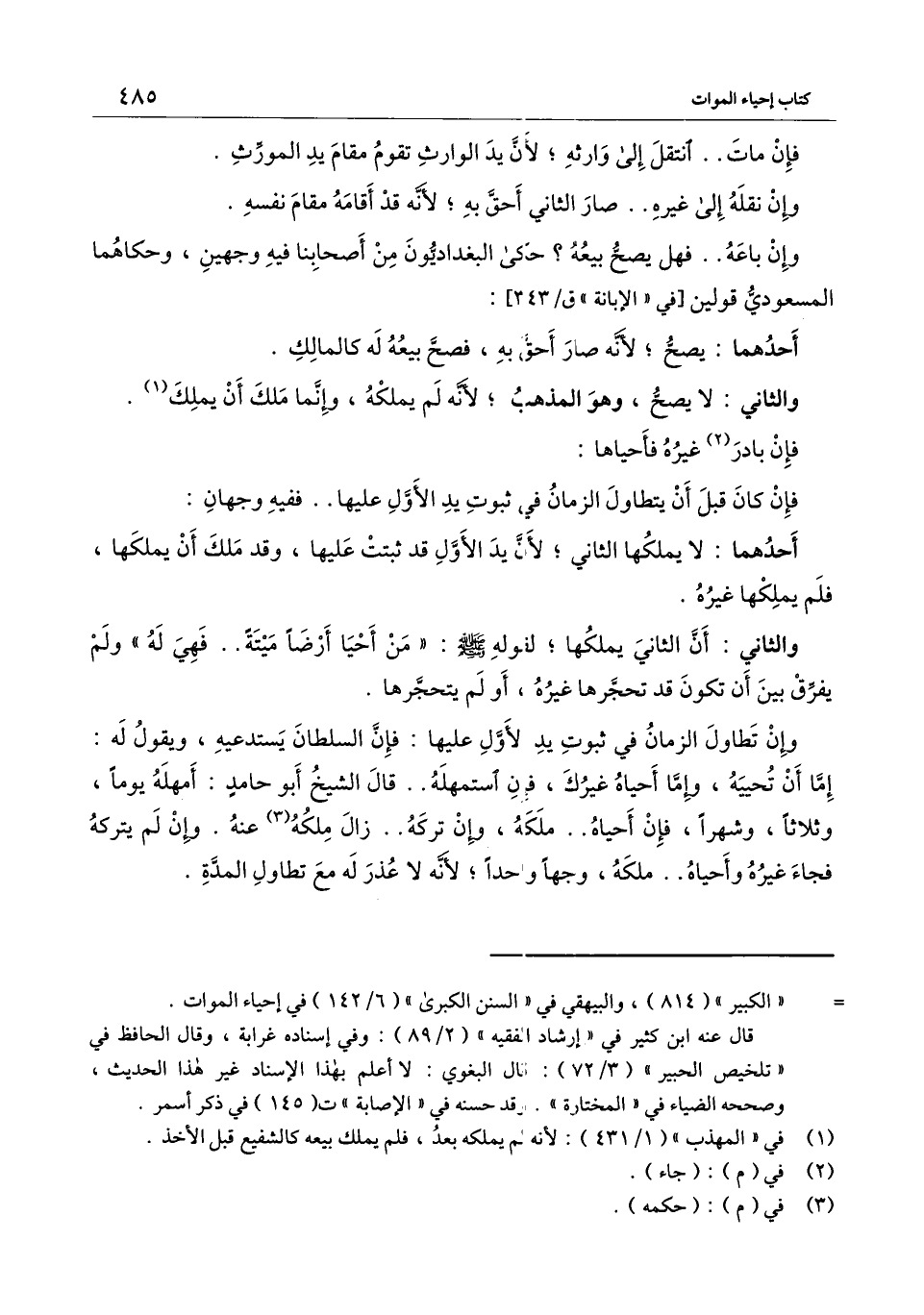 وإن تطاول الزمان في ثبوت يد الأول عليها: فإن السلطان يستدعيه، ويقول له: إما أن تحييه، وإما أحياه غيرك، فإن استمهله.. قال الشيخ أبو حامد: أمهله يومًا، وثلاثًا، وشهرًا، فإن أحياه.. ملكه، وإن تركه.. زال ملكه عنه. وإن لم يتركه فجاء غيره وأحياه.. ملكه، وجهًا واحدًا؛ لأنه لا عذر له مع تطاول المدة.