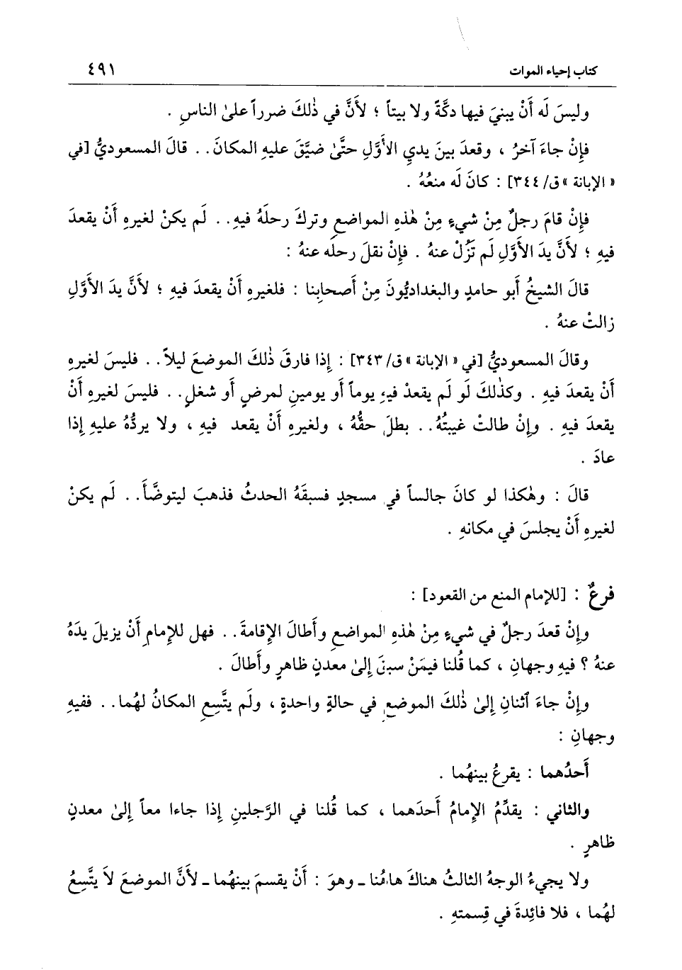 وقال المسعودي [في " الإبانة " ق \ 343] : إذا فارق ذلك الموضع ليلًا.. فليس لغيره أن يقعد فيه. وكذلك لو لم يقعد فيه يومًا أو يومين لمرض أو شغل.. فليس لغيره أن يقعد فيه. وإن طالت غيبته.. بطل حقه، ولغيره أن يقعد فيه، ولا يرده عليه إذا عاد.