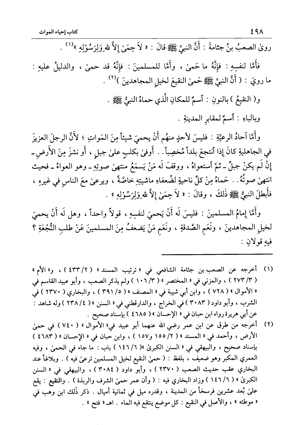وأما إمام المسلمين: فليس له أن يحمي لنفسه، قولًا واحدًا، وهل له أن يحمي لخيل المجاهدين، ونعم الصدقة، ونعم من يضعف من المسلمين عن طلب النجعة؟ فيه قولان: