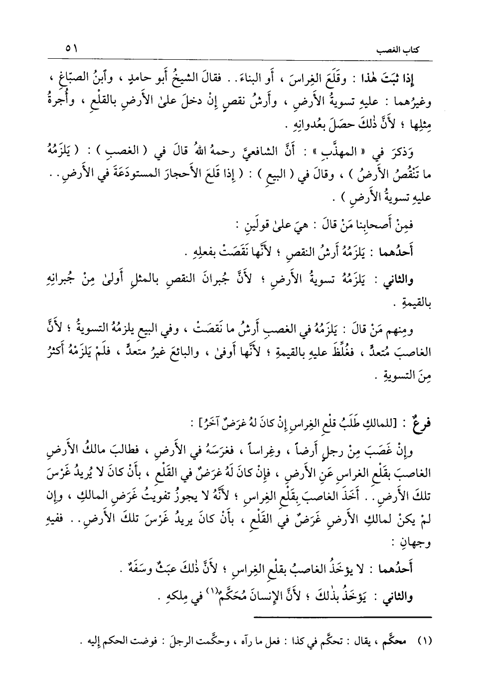 ] : وإن غصب من رجل أرضاً، وغراساً، فغرسه في الأرض، فطالب مالك الأرض الغاصب بقلع الغراس عن الأرض، فإن كان له غرض في القلع، بأن كان لا يريد غرس تلك الأرض.. أخذ الغاصب بقلع الغراس؛ لأنه لا يجوز تفويت غرض المالك، وإن لم يكن لمالك الأرض غرض في القلع، بأن كان يريد غرس تلك الأرض.. ففيه وجهان: