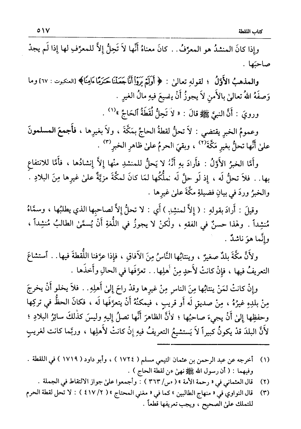 وأما الخبر الأول: فأراد به أنه لا يحل للمنشد منها إلا إنشادها، فأما للانتفاع بها.. فلا تحل له، إذا لو حل له تملكها لما كان لمكة مزية على غيرها من البلاد. والخبر ورد في بيان فضيلة مكة على غيرها.