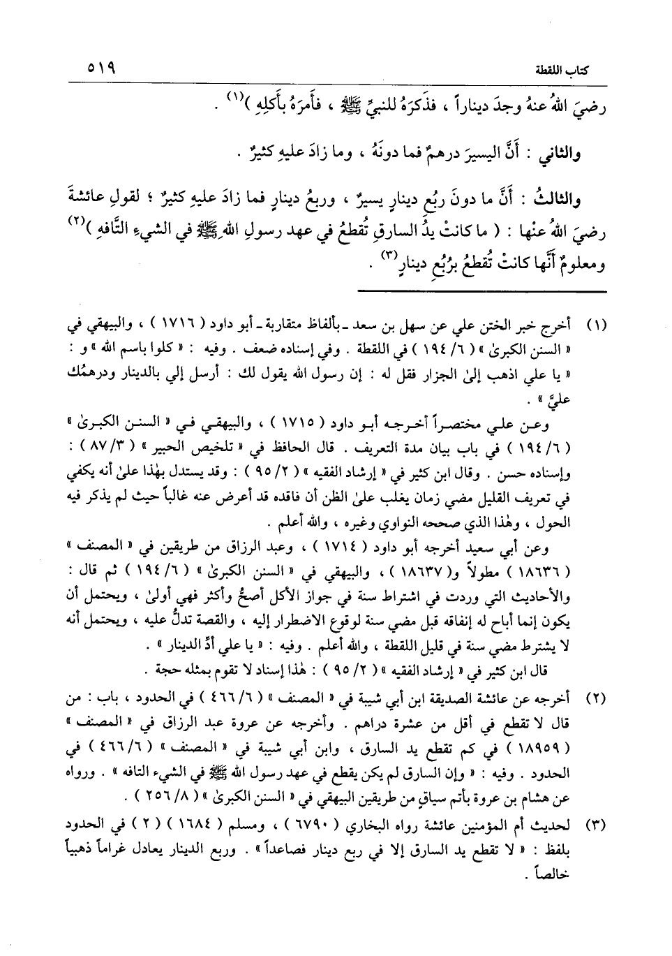 والثالث: أن ما دون ربع دينار يسير، وربع دينار فما زاد عليه كثير؛ لقول عائشة - رَضِيَ اللَّهُ عَنْهَا -: «ما كانت يد السارق تقطع في عهد رسول الله - صَلَّى اللَّهُ عَلَيْهِ وَسَلَّمَ - في الشيء التافه» . ومعلوم أنها كانت تقطع بربع دينار.