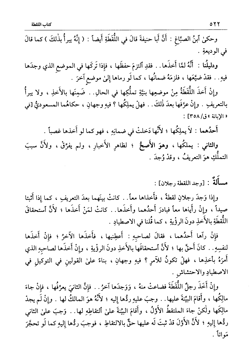 وإذا وجد رجلان لقطة، فأخذاها معا.. كانت بينهما بعد التعريف، كما إذا أثبتا صيدا، وإن رأياها معا فبادر أحدهما وأخذها.. كانت لمن أخذها؛ لأن استحقاق اللقطة بالأخذ دون الرؤية، كما قلنا في الاصطياد.