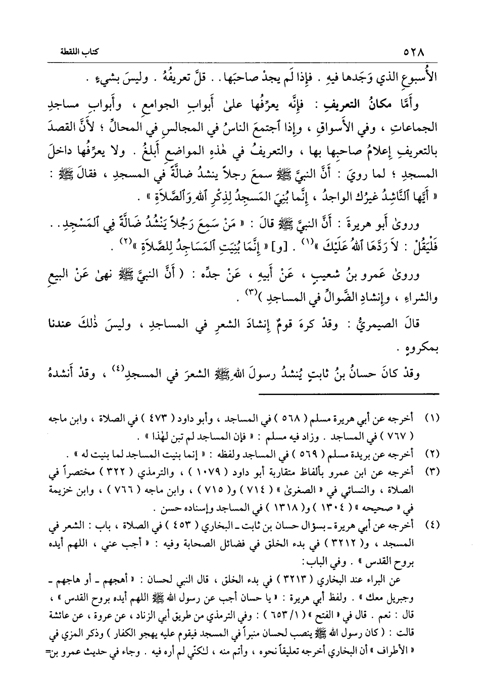 وروى عمرو بن شعيب، عن أبيه، عن جده: «أن النبي - صَلَّى اللَّهُ عَلَيْهِ وَسَلَّمَ - نهى عن البيع والشراء، وإنشاد الضوال في المساجد» .