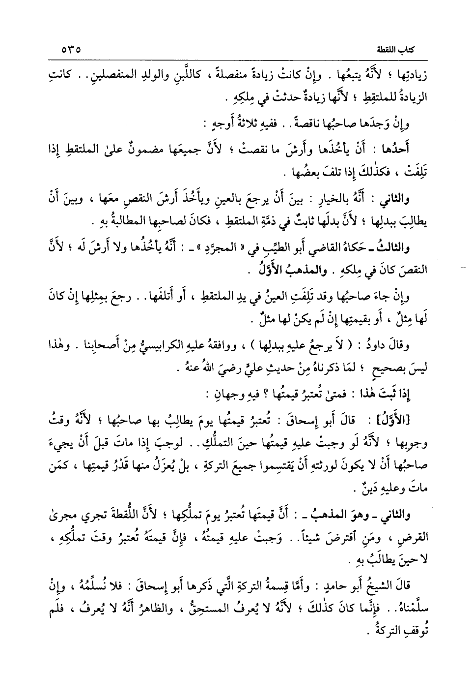 والثاني: أنه بالخيار: بين أن يرجع بالعين ويأخذ أرش النقص معها، وبين أن يطالب ببدلها؛ لأن بدلها ثابت في ذمة الملتقط، فكان لصاحبها المطالبة به.