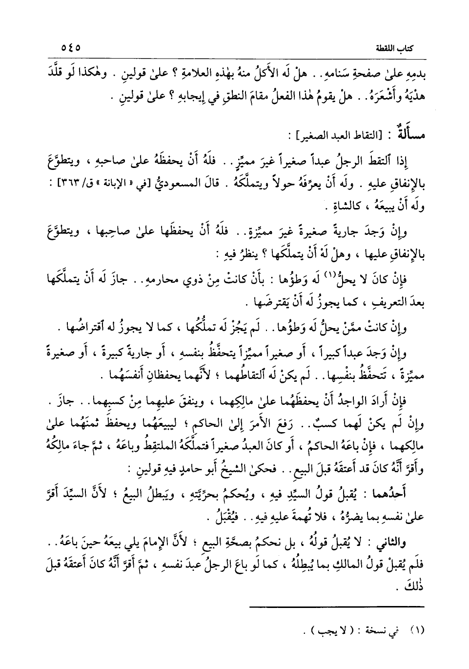 فإن أراد الواجد أن يحفظهما على مالكهما، وينفق عليهما من كسبهما.. جاز. وإن لم يكن لهما كسب.. رفع الأمر إلى الحاكم؛ ليبيعهما، ويحفظ ثمنهما على مالكهما، فإن باعه الحاكم، أو كان العبد صغيرًا فتملكه المتلقط وباعه، ثم جاء مالكه وأقر أنه كان قد أعتق قبل البيع.. فحكى الشيخ أبو حامد فيه قولين: