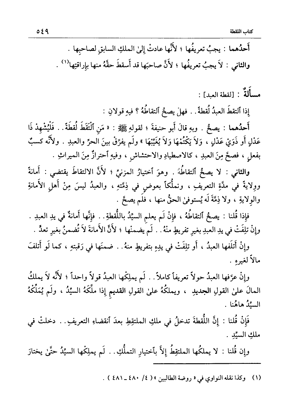 وإن عرفها العبد حولًا تعريفًا كاملًا.. لم يملكها العبد قولًا واحدًا؛ لأنه لا يملك المال على القول الجديد، ويملكه على القول القديم إذا ملكه السيد، ولم يملكه السيد هاهنا.