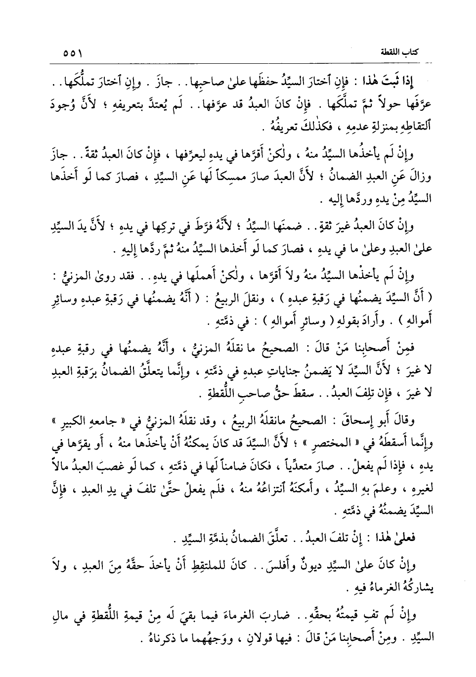فمن أصحابنا من قال: الصحيح ما نقله المزني، وأنه يضمنها في رقبة عبده لا غير؛ لأن السيد لا يضمن جنايات عبده في ذمته، وإنما يتعلق الضمان برقبة العبد لا غير، فإن تلف العبد.. سقط حق صاحب اللقطة.