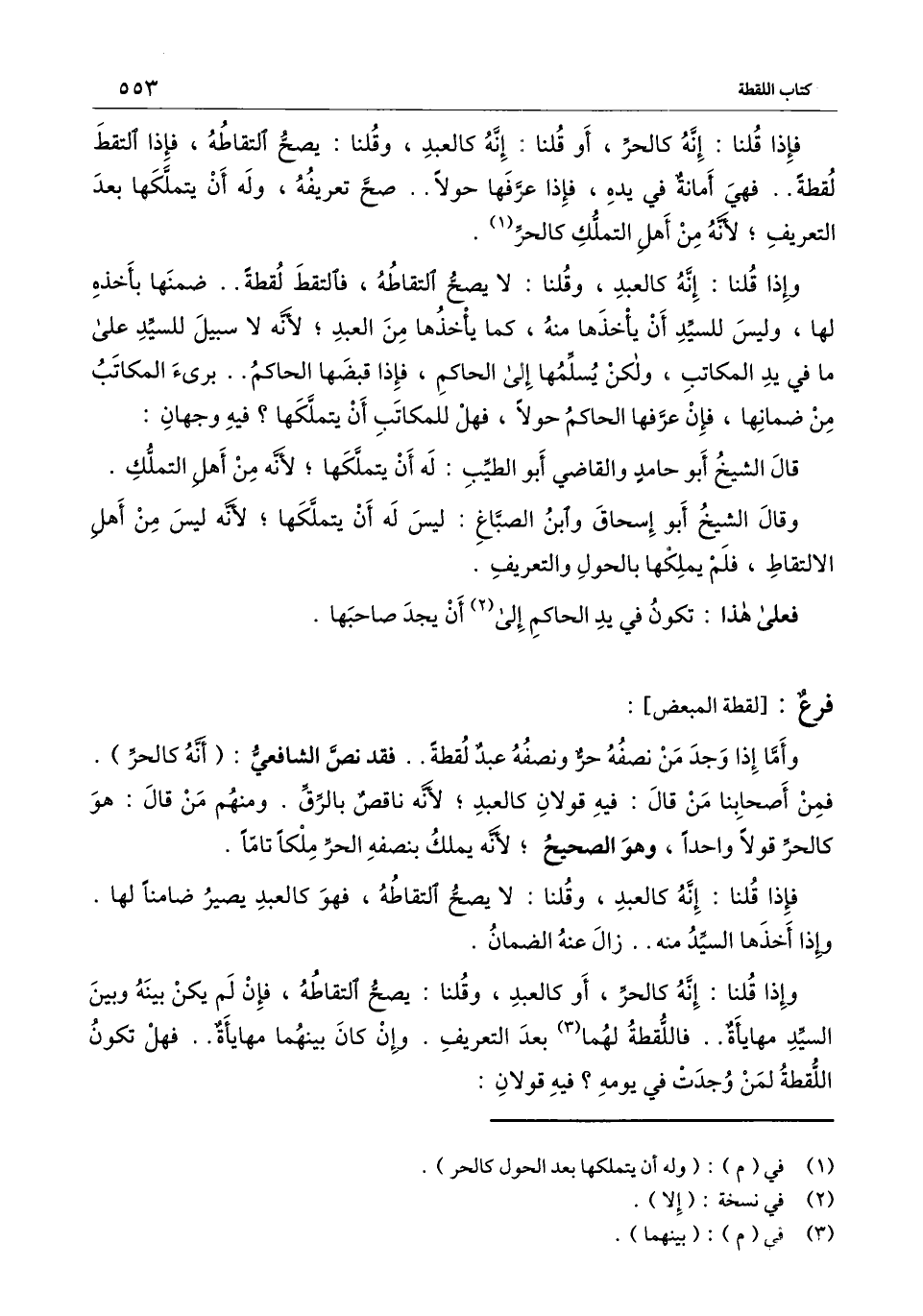 وأما إذا وجد من نصفه حر ونصفه عبد لقطة.. فقد نص الشافعي: (أنه كالحر) . فمن أصحابنا من قال: فيه قولان كالعبد؛ لأنه ناقص بالرق. ومنهم من قال: هو كالحر قولًا واحدًا، وهو الصحيح؛ لأنه يملك بنصفه الحر ملكًا تامًا.
