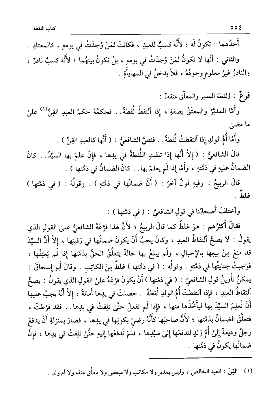 فقال أكثرهم: هو غلط كما قال الربيع؛ لأن هذا فرعه الشافعي على القول الذي يقول: لا يصح التقاط العبد، وكان يجب أن يكون ضمانها في رقبتها، إلا أن السيد قد منع من بيعها بالإحبال، ولم يبلغ بها حالة يتعلق الحق بذمتها إذا لم يعتقها، فوجبت جنايتها في ذمته. وقوله (في ذمتها) غلط من الكاتب. وقال أبو إسحاق: يمكن تأويل قول الشافعي: (في ذمتها) أن يكون فرعه على القول الذي يقول: يصح التقاط العبد، فإذا التقطت أم الولد لقطة.. حصلت في يدها أمانة، إلا أنه يجب عليها أن تعلم السيد بها ليأخذها منها، فإذا لم تفعل حتى تلفت في يدها.. فقد فرطت، فتعلق الضمان بذمتها؛ لأن صاحبها كأنه رضي بكونها في يدها، فصار بمنزلة أن يدفع رجل وديعة إلى أم ولد لتدفعها إلى سيدها، فلم تدفعها حتى تلفت في يدها، فإن ضمانها يكون في ذمتها.