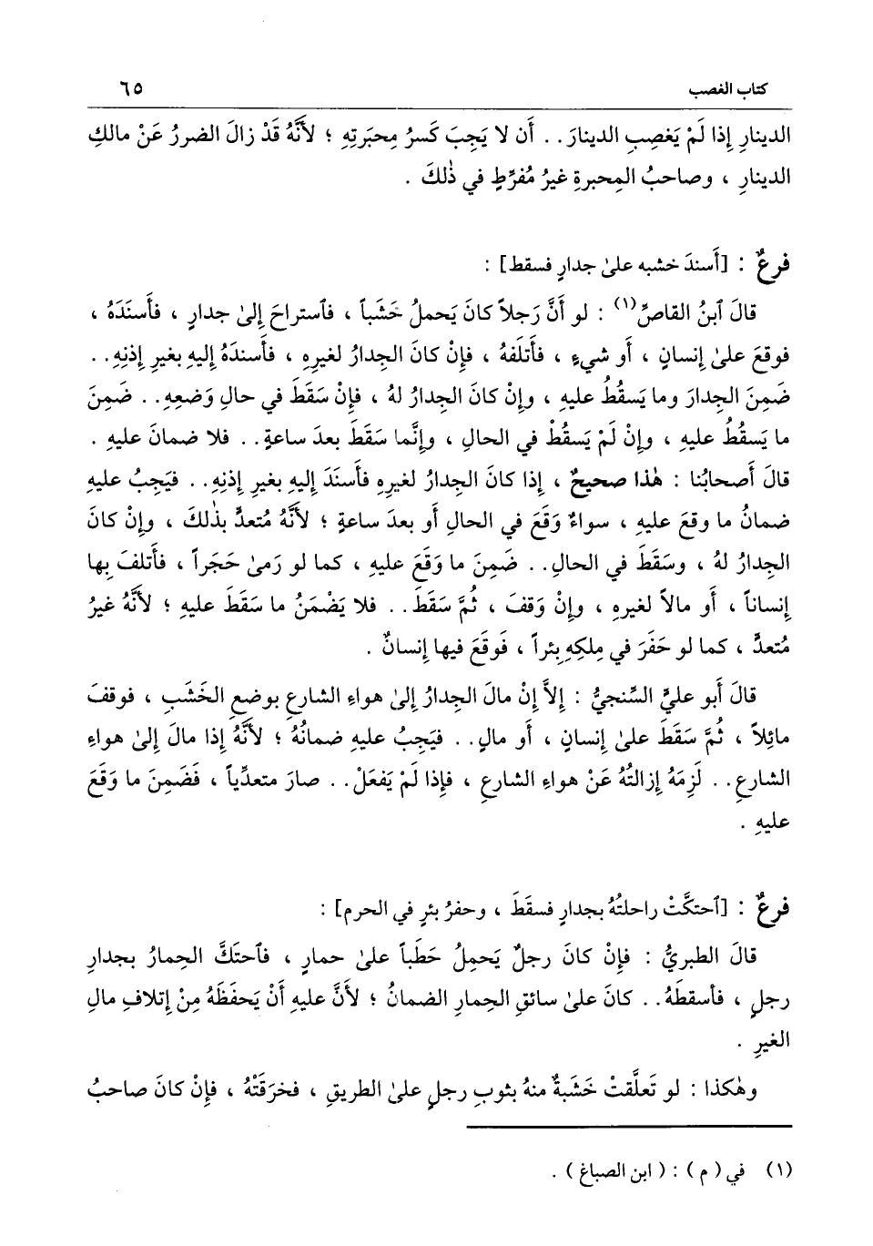 ] : قال ابن القاص: لو أن رجلاً كان يحمل خشباً، فاستراح إلى جدار، فأسنده، فوقع على إنسان، أو شيء، فأتلفه، فإن كان الجدار لغيره، فأسنده إليه بغير إذنه.. ضمن الجدار وما يسقط عليه، وإن كان الجدار له، فإن سقط في حال وضعه.. ضمن ما يسقط عليه، وإن لم يسقط في الحال، وإنما سقط بعد ساعة.. فلا ضمان عليه.