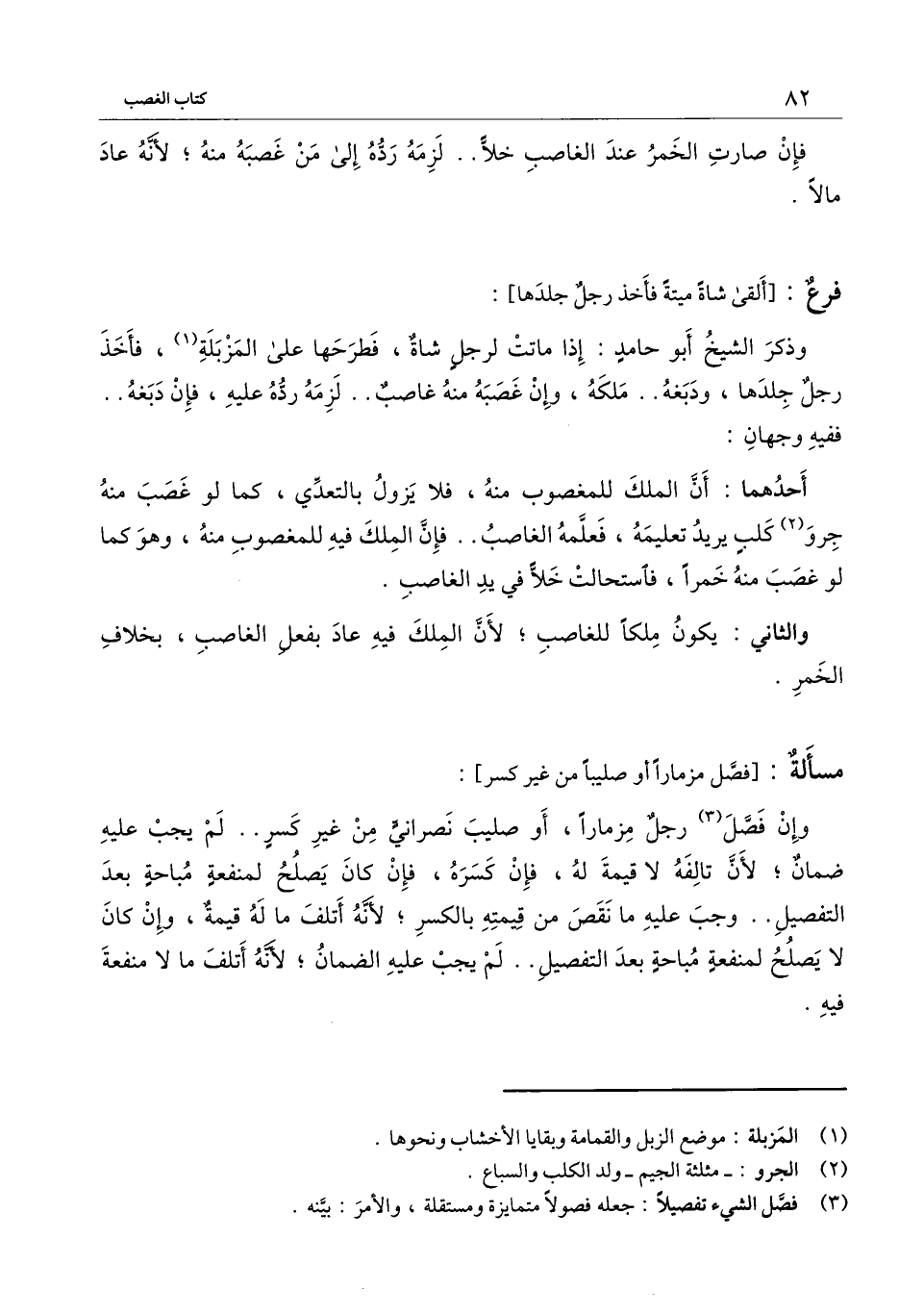 ] : وذكر الشيخ أبو حامد: إذا ماتت لرجل شاة، فطرحها على المزبلة، فأخذ رجل جلدها، ودبغه.. ملكه، وإن غصبه منه غاصب.. لزمه رده عليه، فإن دبغه.. ففيه وجهان: