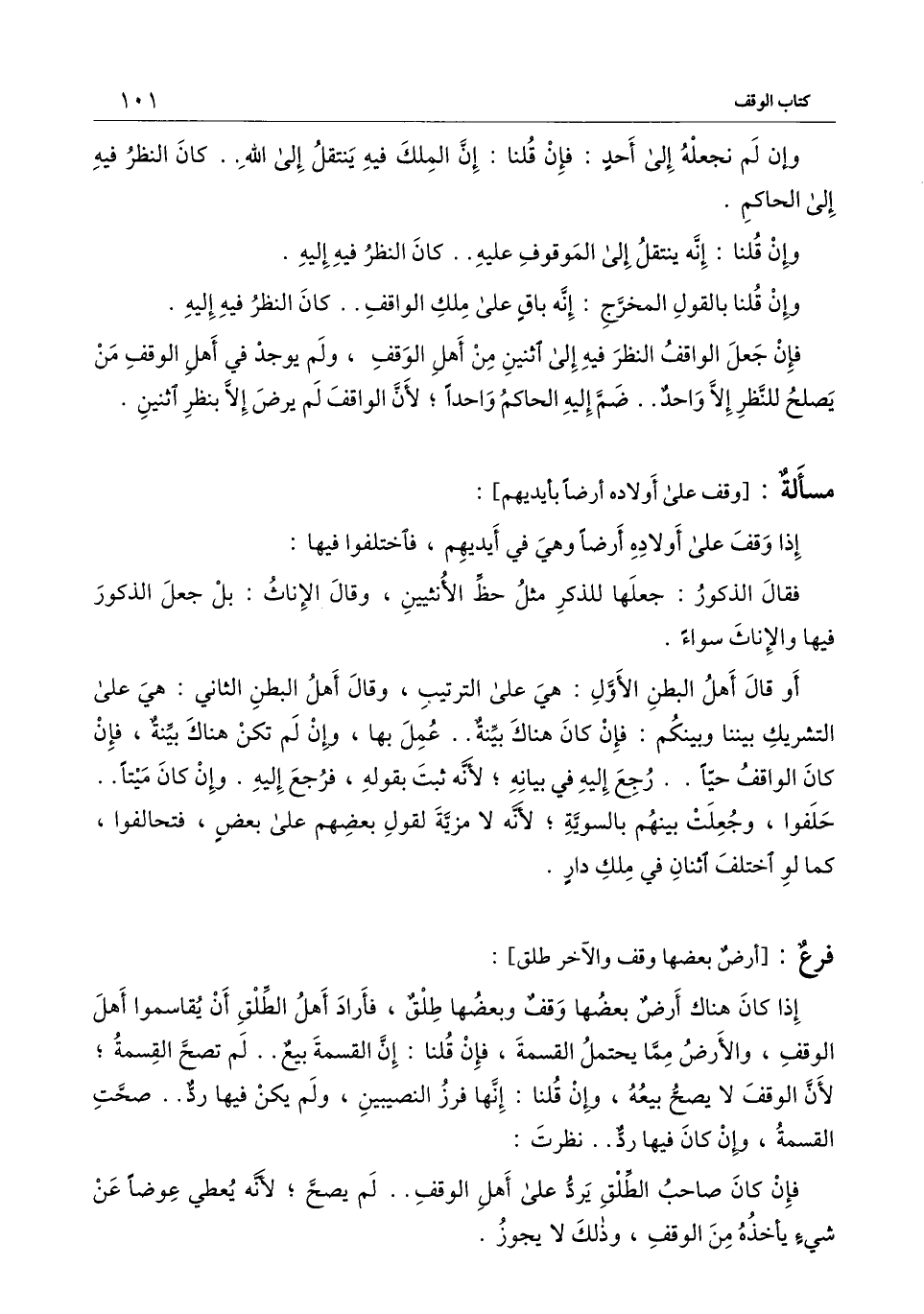 إذا كان هناك أرض بعضها وقف وبعضها طلق، فأراد أهل الطلق أن يقاسموا أهل الوقف، والأرض مما يحتمل القسمة، فإن قلنا: إن القسمة بيع.. لم تصح القسمة؛ لأن الوقف لا يصح بيعه، وإن قلنا: إنها فرز النصيبين، ولم يكن فيها رد.. صحت القسمة، وإن كان فيها رد.. نظرت:
