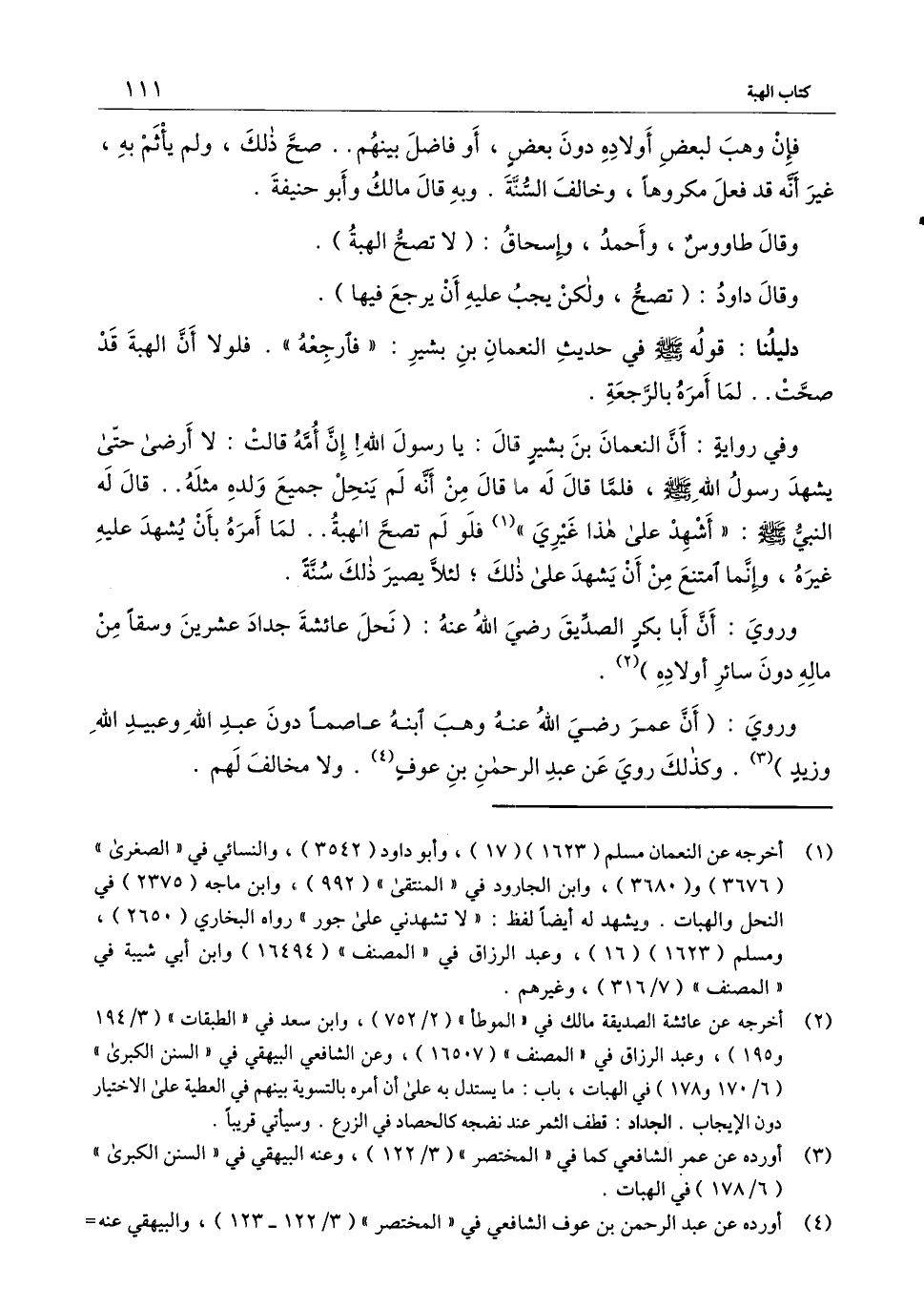 وفي رواية: «أن النعمان بن بشير قال: يا رسول الله! إن أمه قالت: لا أرضى حتى يشهد رسول الله - صَلَّى اللَّهُ عَلَيْهِ وَسَلَّمَ -، فلما قال له ما قال من أنه لم ينحل جميع ولده مثله.. قال له النبي - صَلَّى اللَّهُ عَلَيْهِ وَسَلَّمَ - " أشهد على هذا غيري» فلو لم تصح الهبة.. لما أمره بأن يشهد عليه غيره، وإنما امتنع من أن يشهد على ذلك، لئلا يصير ذلك سنة.