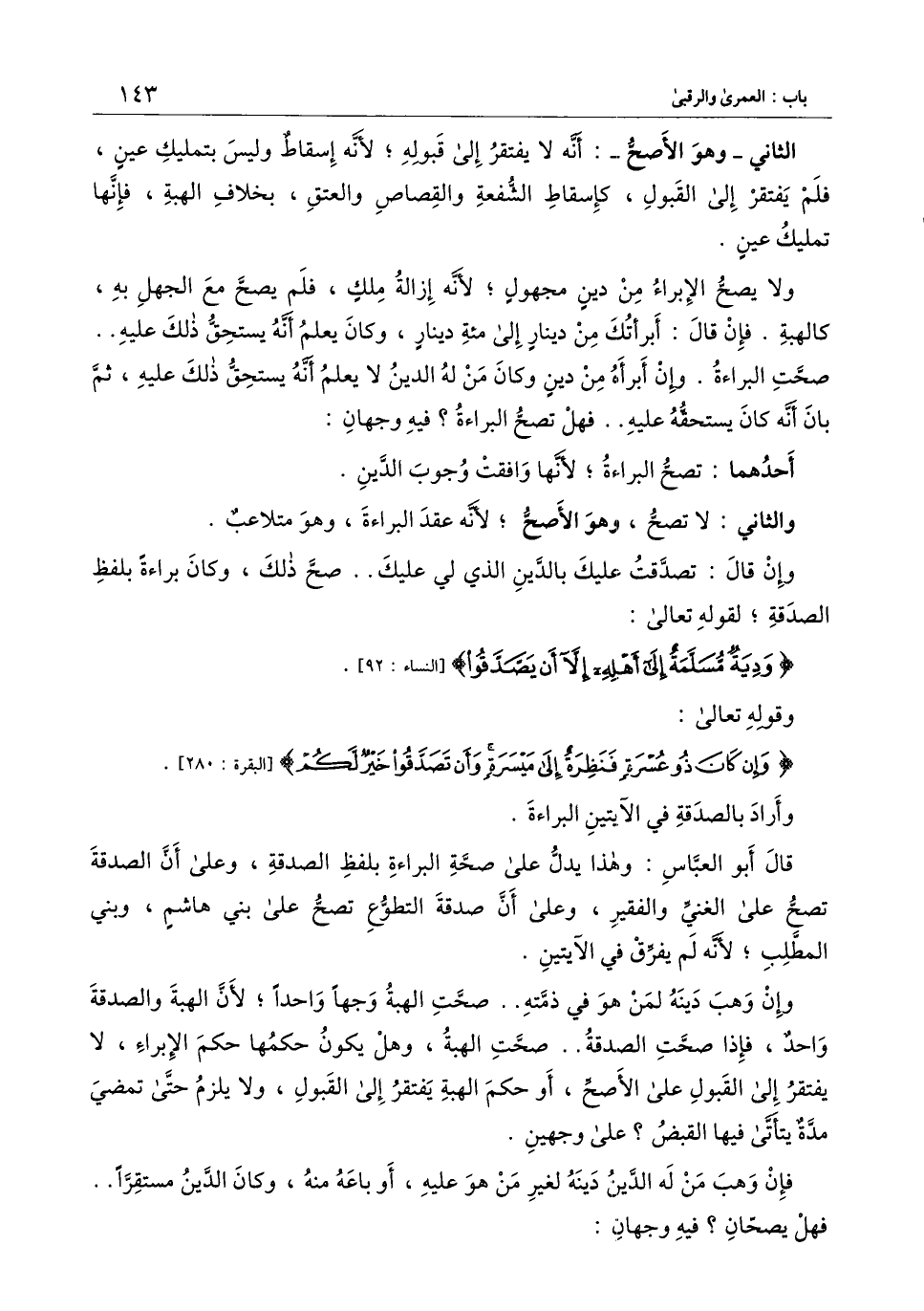 قال أبو العباس: وهذا يدل على صحة البراءة بلفظ الصدقة، وعلى أن الصدقة تصح على الغني والفقير، وعلى أن صدقة التطوع تصح على بني هاشم، وبني المطلب؛ لأنه لم يفرق في الآيتين.