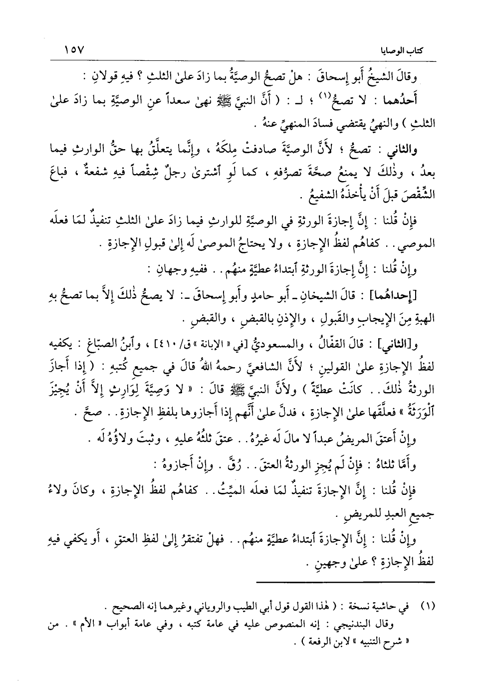 وقال الشيخ أبو إسحاق: هل تصح الوصية بما زاد على الثلث؟ فيه قولان: