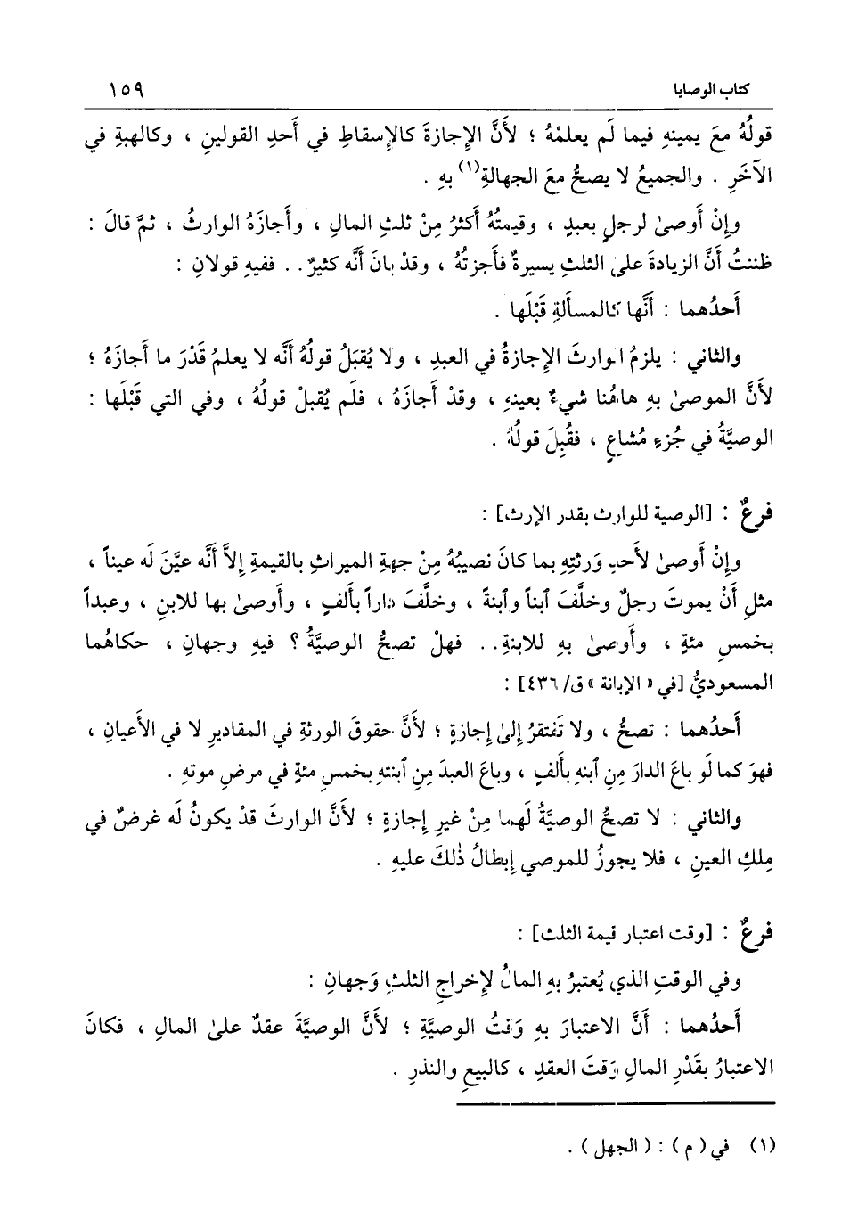 والثاني: يلزم الوارث الإجازة في العبد، ولا يقبل قوله أنه لا يعلم قدر ما أجازه؛ لأن الموصى به هاهنا شيء بعينه، وقد أجازه، فلم يقبل قوله، وفي التي قبلها: الوصية في جزء مشاع، فقبل قوله.