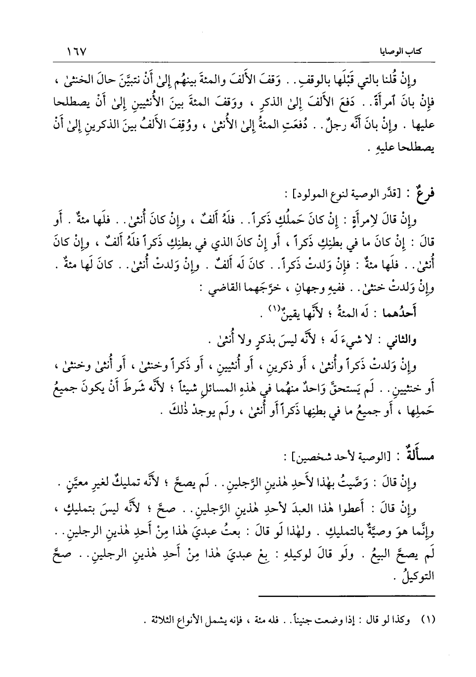 وإن قلنا بالتي قبلها بالوقف.. وقف الألف والمائة بينهم إلى أن نتبين حال الخنثى، فإن بان امرأة.. دفع الألف إلى الذكر، ووقف المائة بين الأنثيين إلى أن يصطلحا عليها. وإن بان أنه رجل.. دفعت المائة إلى الأنثى، ووقف الألف بين الذكرين إلى أن يصطلحا عليه.