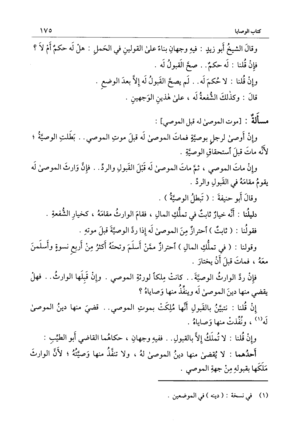 وإن مات الموصي، ثم مات الموصى له قبل القبول والرد.. فإن وارث الموصى له يقوم مقامه في القبول والرد.