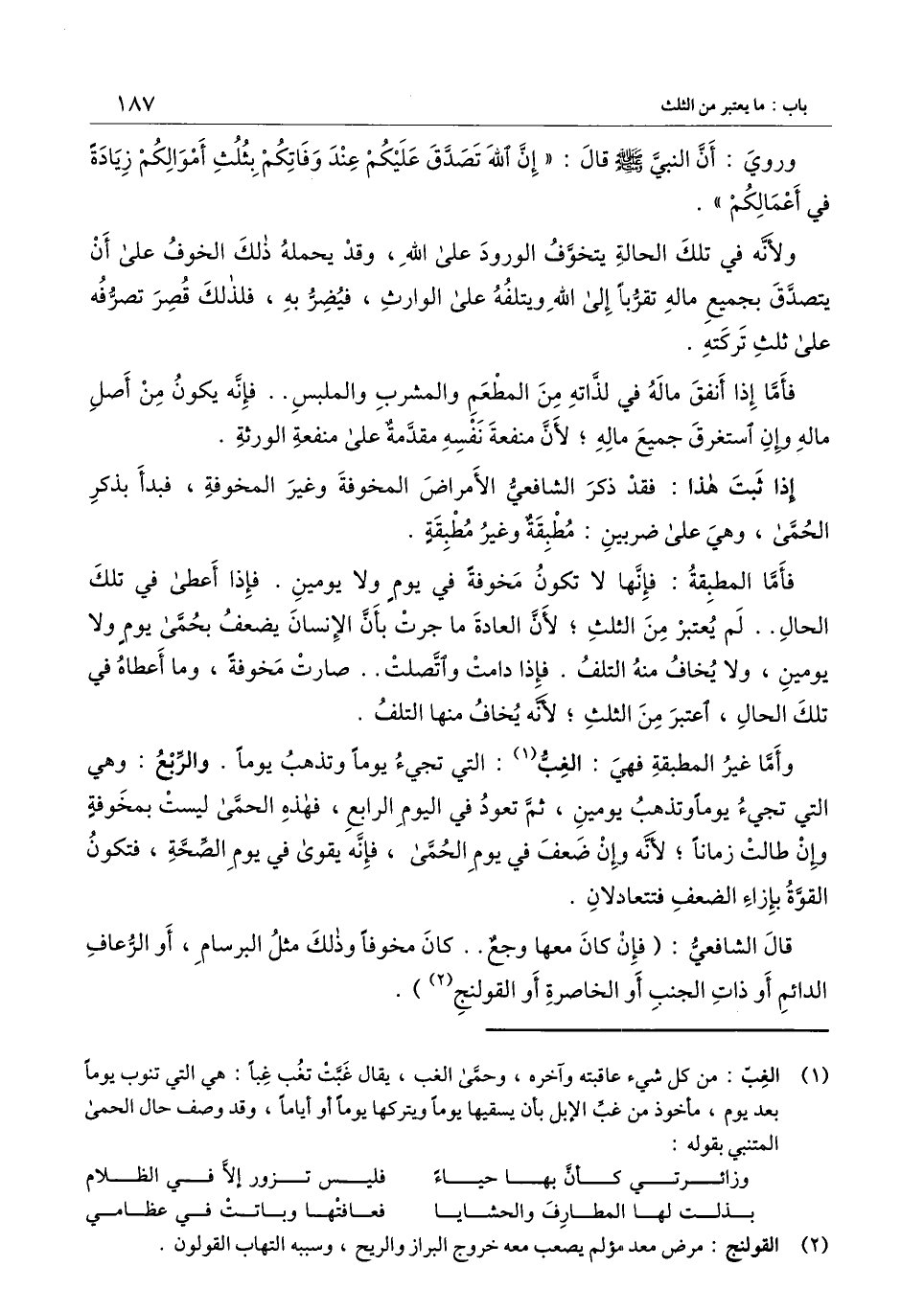 ولأنه في تلك الحالة يتخوف الورود على الله، وقد يحمله ذلك الخوف على أن يتصدق بجميع ماله تقربا إلى الله ويتلفه على الوارث، فيضر به، فلذلك قصر تصرفه على ثلث تركته.