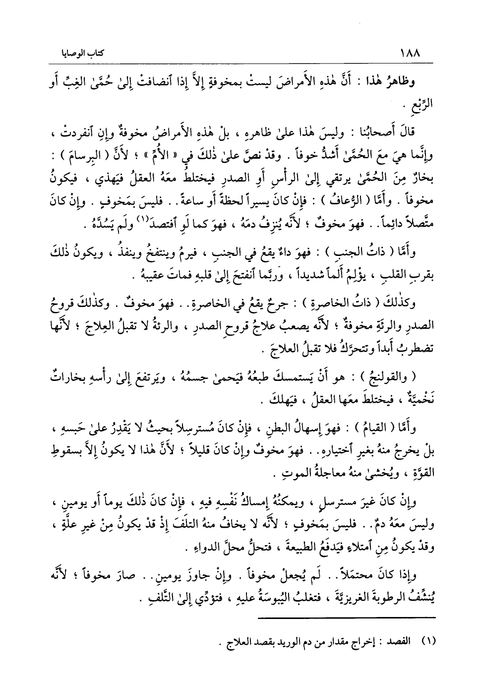 قال أصحابنا: وليس هذا على ظاهره، بل هذه الأمراض مخوفة وإن انفردت، وإنما هي مع الحمى أشد خوفا. وقد نص على ذلك في " الأم "؛ لأن (البرسام) : بخار من الحمى يرتقي إلى الرأس أو الصدر فيختلط معه العقل فيهذي، فيكون مخوفا. وأما (الرعاف) : فإن كان يسيرا لحظة أو ساعة.. فليس بمخوف. وإن كان متصلا دائما.. فهو مخوف؛ لأنه ينزف دمه، فهو كما لو افتصد ولم يسده.
