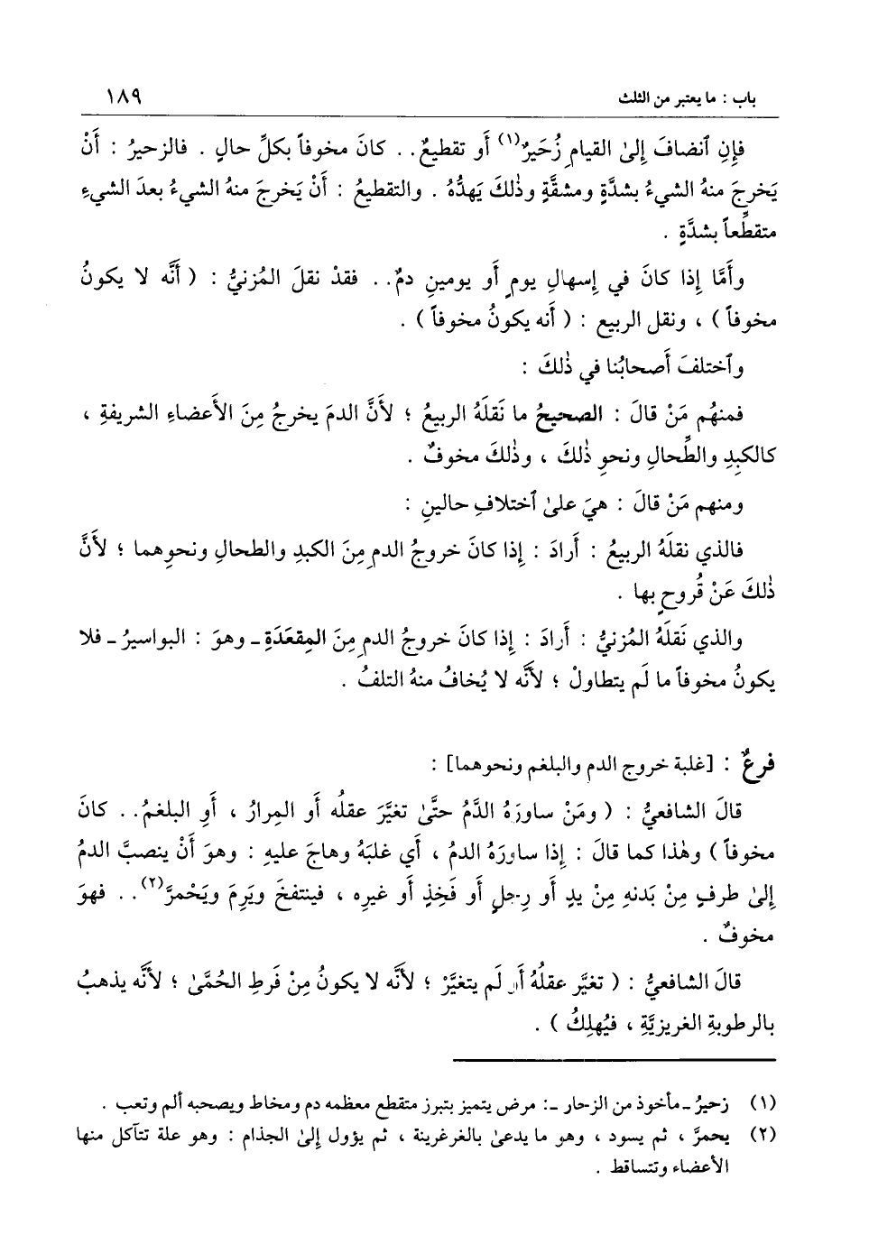 ) : قال الشافعي: (ومن ساوره الدم حتى تغير عقله أو المرار، أو البلغم.. كان مخوفا) وهذا كما قال: إذا ساوره الدم، أي غلبه وهاج عليه: وهو أن ينصب الدم إلى طرف من بدنه من يد أو رجل أو فخذ أو غيره، فينتفخ ويرم ويحمر.. فهو مخوف.