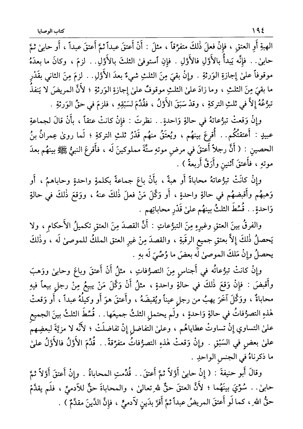 الهبة أو العتق، فإن فعل ذلك متفرقا، مثل: أن أعتق عبدا ثم أعتق عبدا، أو حابى ثم حابى.. فإنه يبدأ بالأول فالأول. فإن استوفى الثلث بالأول.. لزم، وكان ما بعده موقوفا على إجازة الورثة. وإن بقي من الثلث شيء بعد الأول.. لزم من الثاني بقدر ما بقي من الثلث، وما زاد على الثلث موقوف على إجازة الورثة؛ لأن المريض لا ينفذ تبرعه إلا في ثلث التركة، وقد سبق الأول، فقد لسبقه، فلزم في حق الورثة.