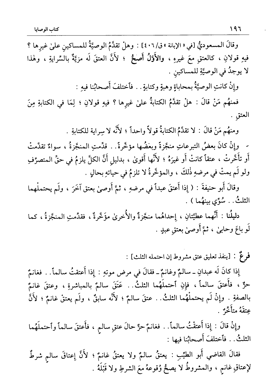 وقال المسعودي (في " الإبانة " ق\406) : وهل تقدم الوصية للمساكين على غيرهما؟ فيه قولان، كالعتق مع غيره، والأول أصح؛ لأن العتق له مزية بالسراية، وهذا لا يوجد في الوصية للمساكين.