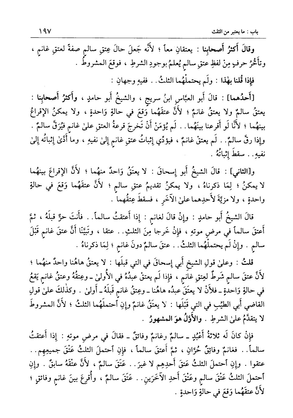 قلت: وعلى قول الشيخ أبي إسحاق في التي قبلها: لا يعتق هاهنا واحد منهما؛ لأن عتق سالم شرط لعتق غانم، فإذا لم يعتق عبده في الأولى - وعتقه وعتق غانم يقع في حالة واحدة - فلأن لا يعتق عبده هاهنا - وعتق غانم قبله - أولى. وكذلك على قول القاضي أبي الطيب في التي قبلها: لا يعتق غانم وإن احتملهما الثلث؛ لأن المشروط لا يتقدم على الشرط. والأول هو المشهور.