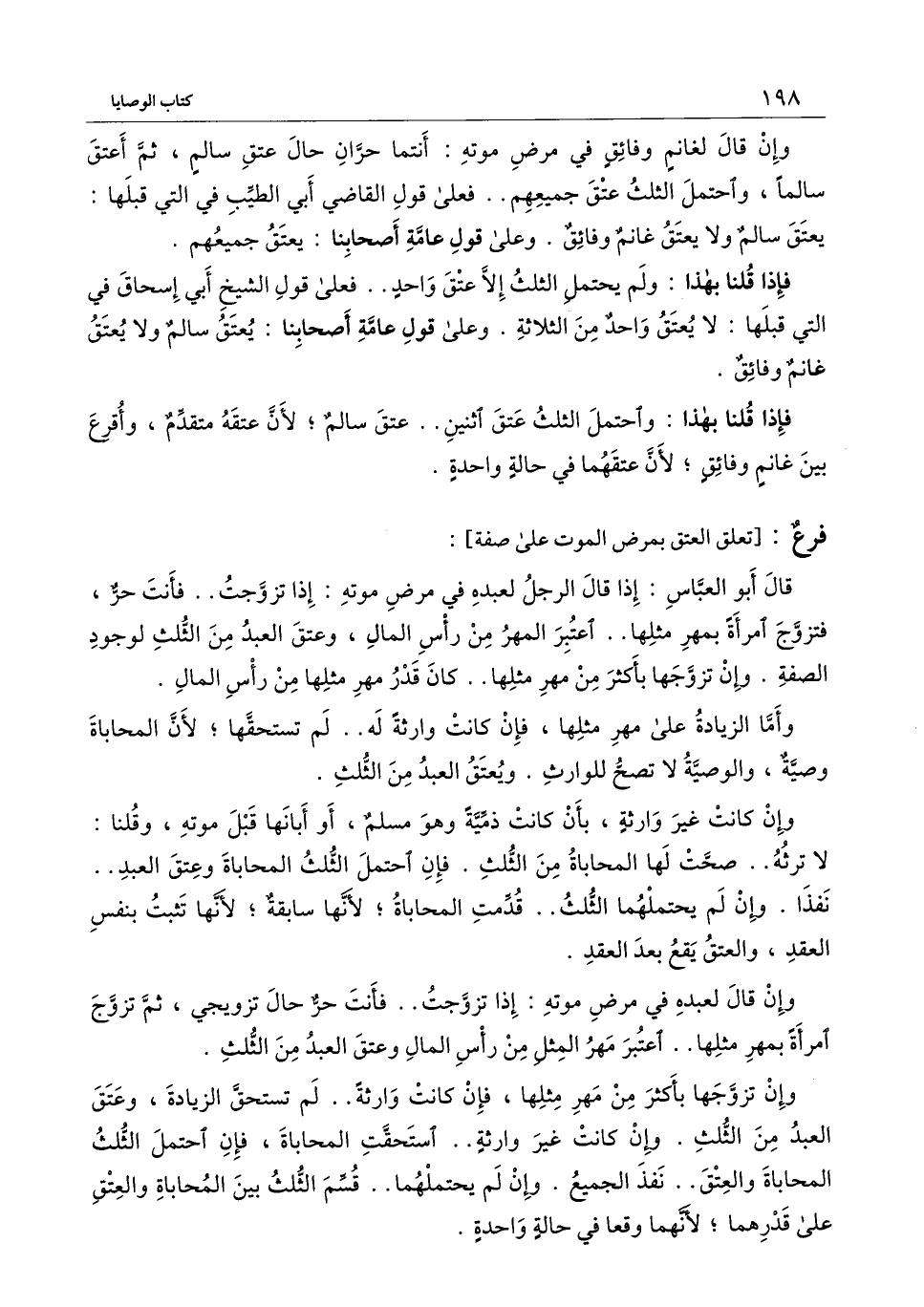 قال أبو العباس: إذا قال الرجل لعبده في مرض موته: إذا تزوجت.. فأنت حر، فتزوج امرأة بمهر مثلها.. اعتبر المهر من رأس المال، وعتق العبد من الثلث لوجود الصفة. وإن تزوجها بأكثر من مهر مثلها.. كان قدر مهر مثلها من رأس المال.
