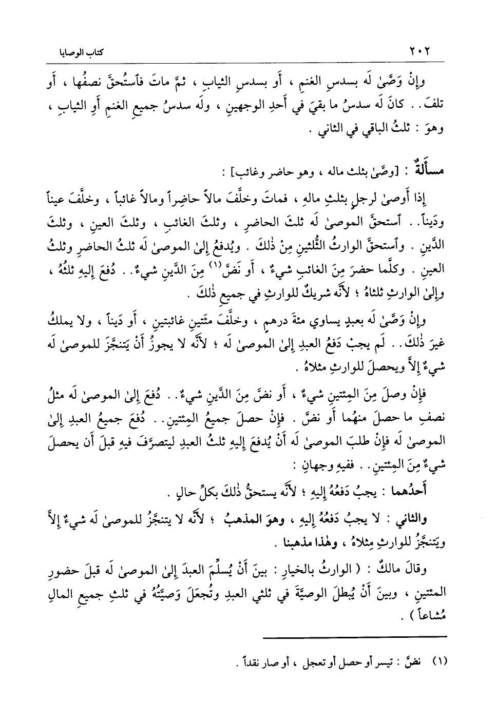 وقال مالك: (الوارث بالخيار: بين أن يسلم العبد إلى الموصى له قبل حضور المائتين، وبين أن يبطل الوصية في ثلثي العبد وتجعل وصيته في ثلث جميع المال مشاعا) .
