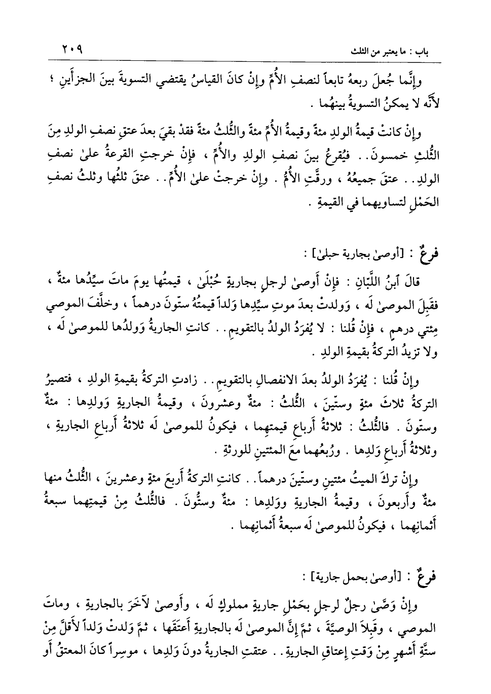 ) : قال ابن اللبان: فإن أوصى لرجل بجارية حبلى، قيمتها يوم مات سيدها مائة، فقبل الموصى له، وولدت بعد موت سيدها ولدا قيمته ستون درهما، وخلف الموصي مائتي درهم، فإن قلنا: لا يفرد بالتقويم.. كانت الجارية وولدها للموصى له، ولا تزيد التركة بقيمة الولد.