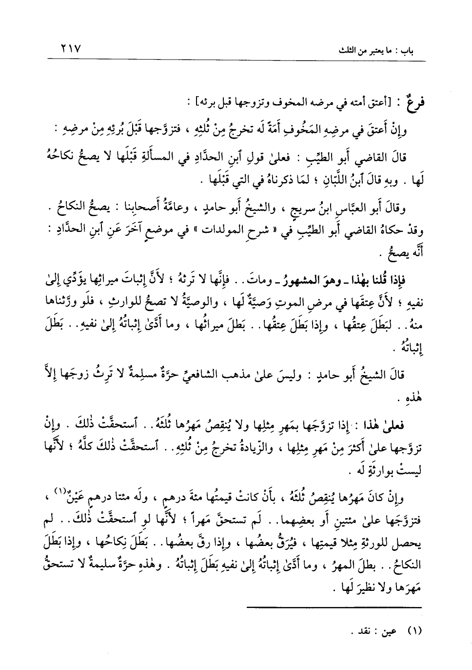 وإن كان مهرها ينقص ثلثه، بأن كانت قيمتها مائة درهم، وله مائتا درهم عين، فتزوجها على مائتين أو بعضهما.. لم تستحق مهرا؛ لأنها لو استحقت ذلك.. لم يحصل للورثة مثلا قيمتها، فيرق بعضها، وإذا رق بعضها.. بطل نكاحها، وإذا بطل النكاح.. بطل المهر، وما أدى إثباته إلى نفيه بطل إثباته. وهذه حرة سليمة لا تستحق مهرها ولا نظير لها.