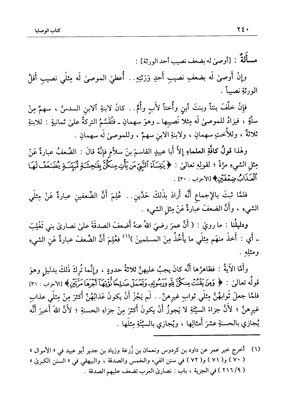 وإن أوصى له بضعف نصيب أحد ورثته.. أعطي الموصى له مثلي نصيب أقل الورثة نصيبا.