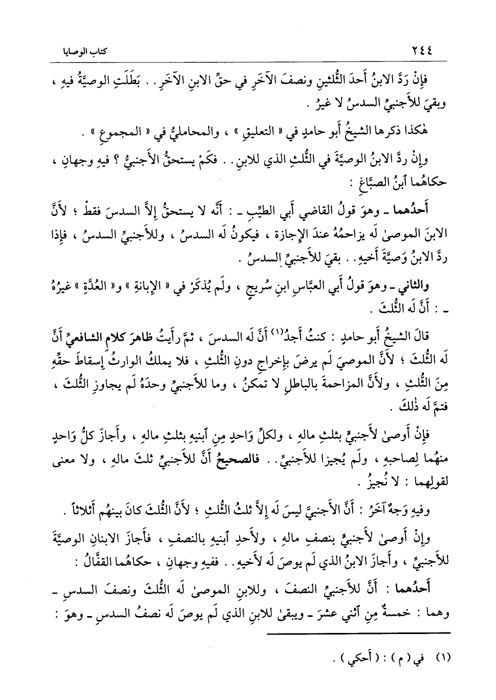 وإن رد الابن الوصية في الثلث الذي للابن.. فكم يستحق الأجنبي؟ فيه وجهان، حكاهما ابن الصباغ: