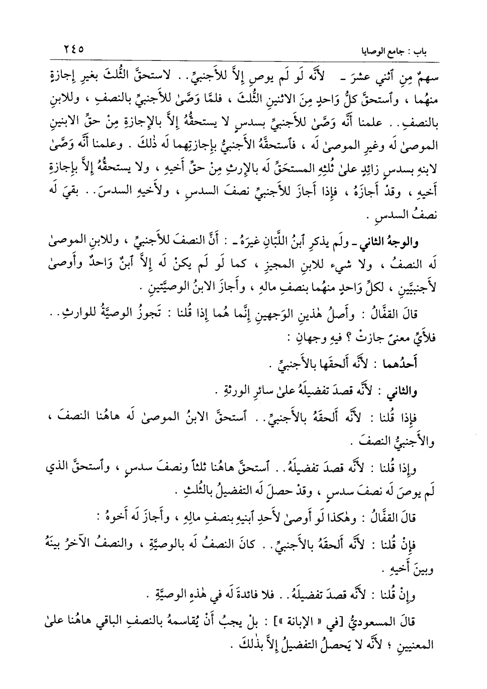 سهم من اثني عشر ـ لأنه لم يوص إلا للأجنبي.. لاستحق الثلث بغير إجازة منهما، واستحق كل واحد من الاثنين الثلث، فلما وصى للأجنبي بالنصف، وللابن بالنصف.. علمنا أنه وصى للأجنبي بسدس لا يستحقه إلا بالإجازة من حق الابنين الموصى له وغير الموصى له، فاستحقه الأجنبي بإجازتهما له ذلك. وعلمنا أنه وصى لابنه بسدس زائد على ثلثه المستحق له بالإرث من حق أخيه، وقد أجازه، فإذا أجاز للأجنبي نصف السدس.. ولأخيه السدس.. بقي له نصف السدس.