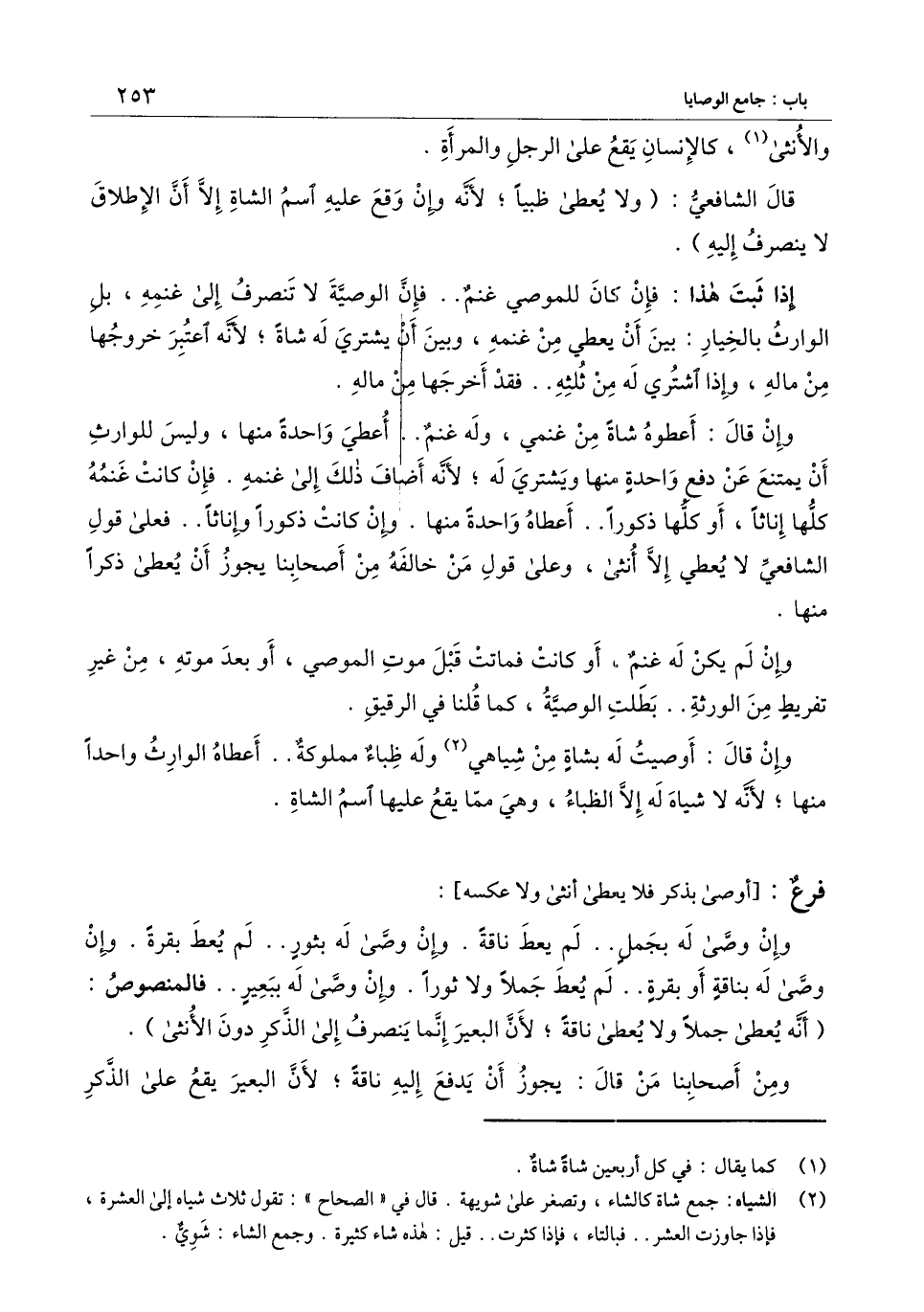 وإن قال: أعطوه شاة من غنمي، وله غنم.. أعطي واحدة منها، وليس للوارث أن يمتنع عن دفع واحدة منها ويشتري له؛ لأنه أضاف ذلك إلى غنمه. فإن كانت غنمه كلها إناثا، أو كلها ذكورا.. أعطاه واحدة منها. وإن كانت ذكورا وإناثا.. فعلى قول الشافعي لا يعطي إلا أنثى، وعلى قول من خالفه من أصحابنا يجوز أن يعطى ذكرا منها.