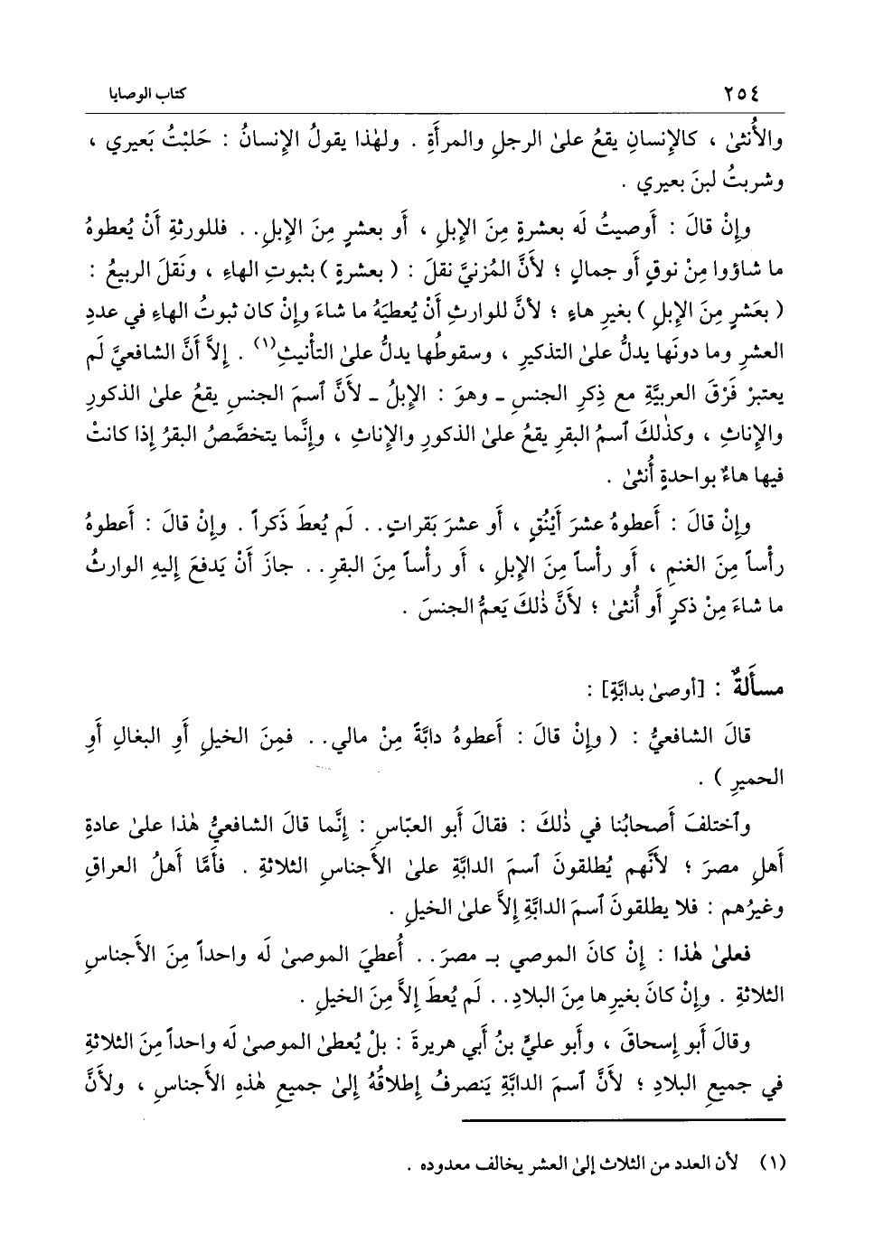 وإن قال: أوصيت له بعشرة من الإبل، أو بعشر من الإبل.. فللورثة أن يعطوه ما شاؤوا من نوق أو جمال؛ لأن المزني نقل: (بعشرة) بثبوت الهاء، ونقل الربيع: (بعشر من الإبل) بغير هاء؛ لأن للوارث أن يعطيه ما شاء وإن كان ثبوت الهاء في عدد العشر وما دونها يدل على التذكير، وسقوطها يدل على التأنيث. إلا أن الشافعي لم يعتبر فرق العربية مع ذكر الجنس - وهو: الإبل - لأن اسم الجنس يقع على الذكور والإناث، وكذلك اسم البقر يقع على الذكور والإناث، وإنما يتخصص البقر إذا كانت فيها هاء بواحدة أنثى.